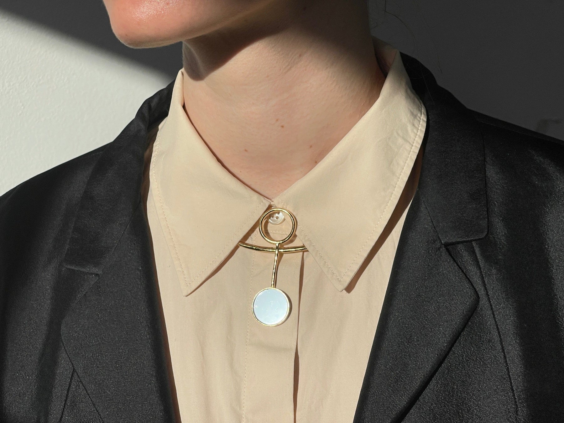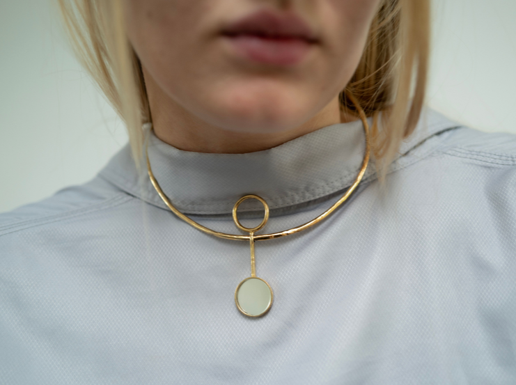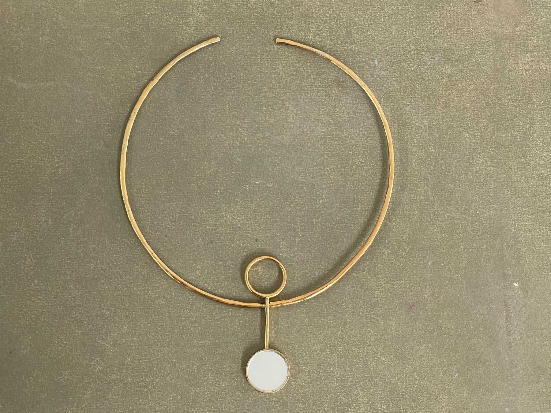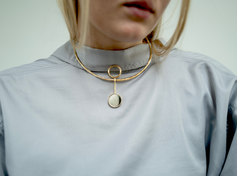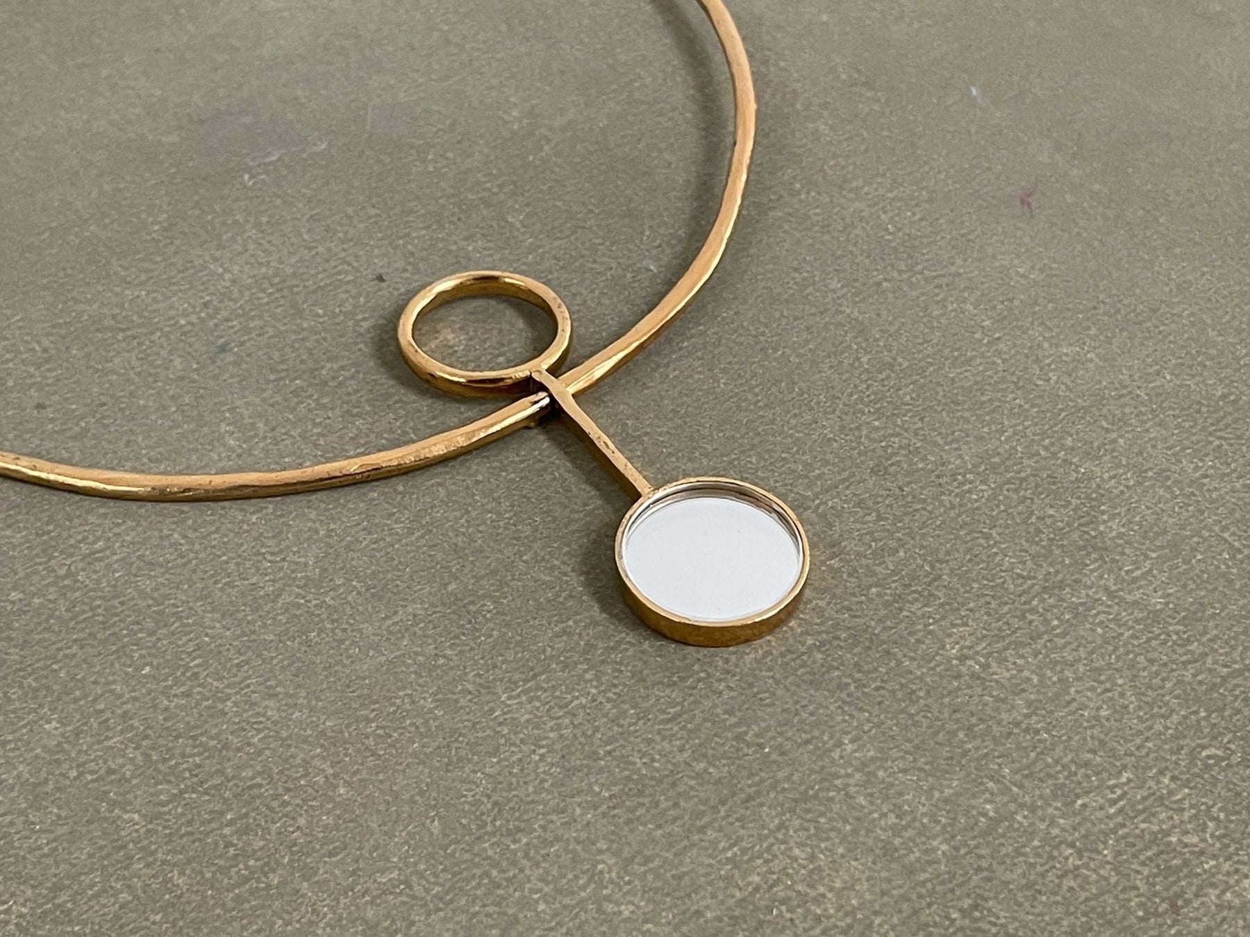 A fine balance choker. The mirror is sliding on the textured neck ring.