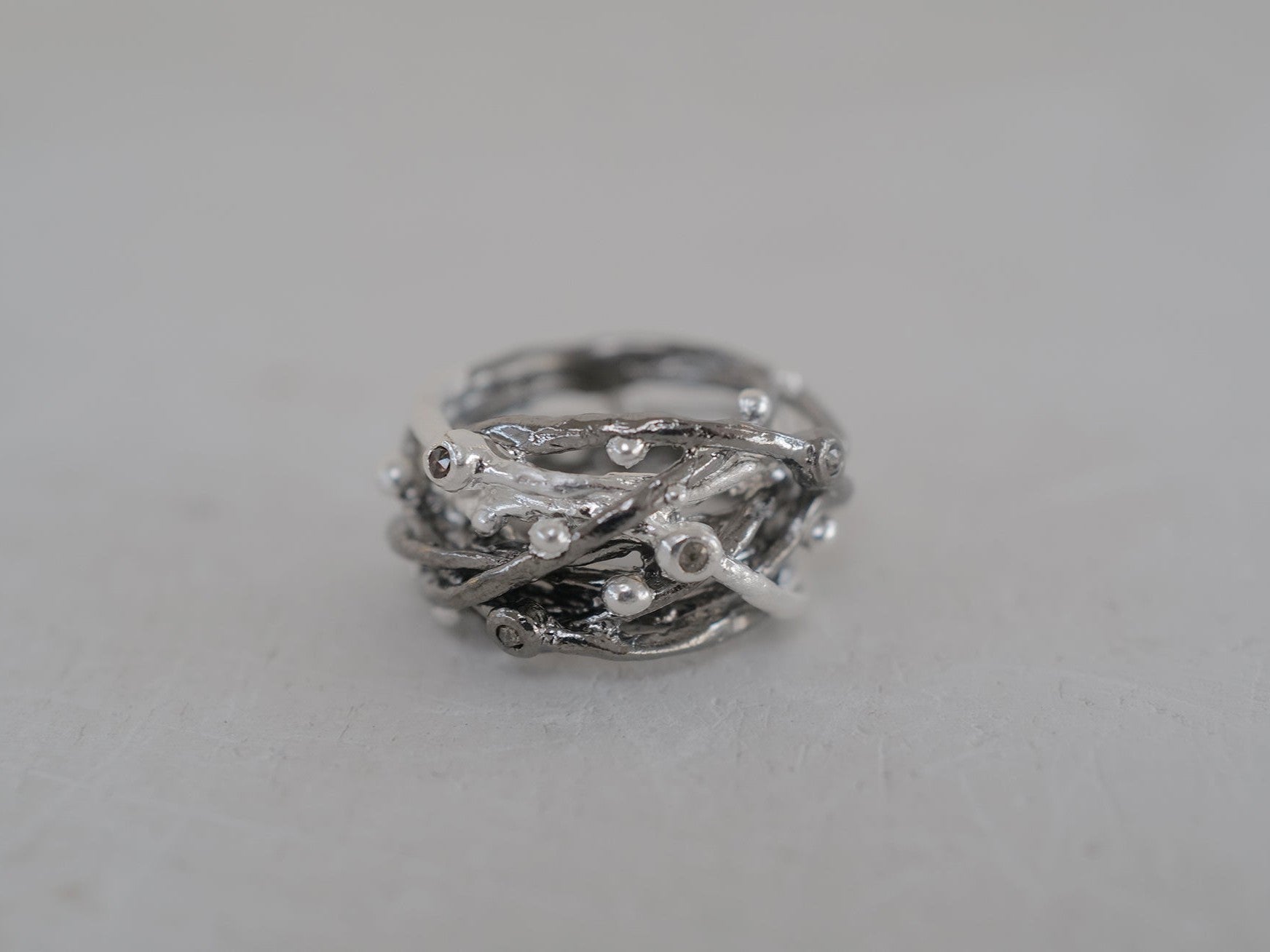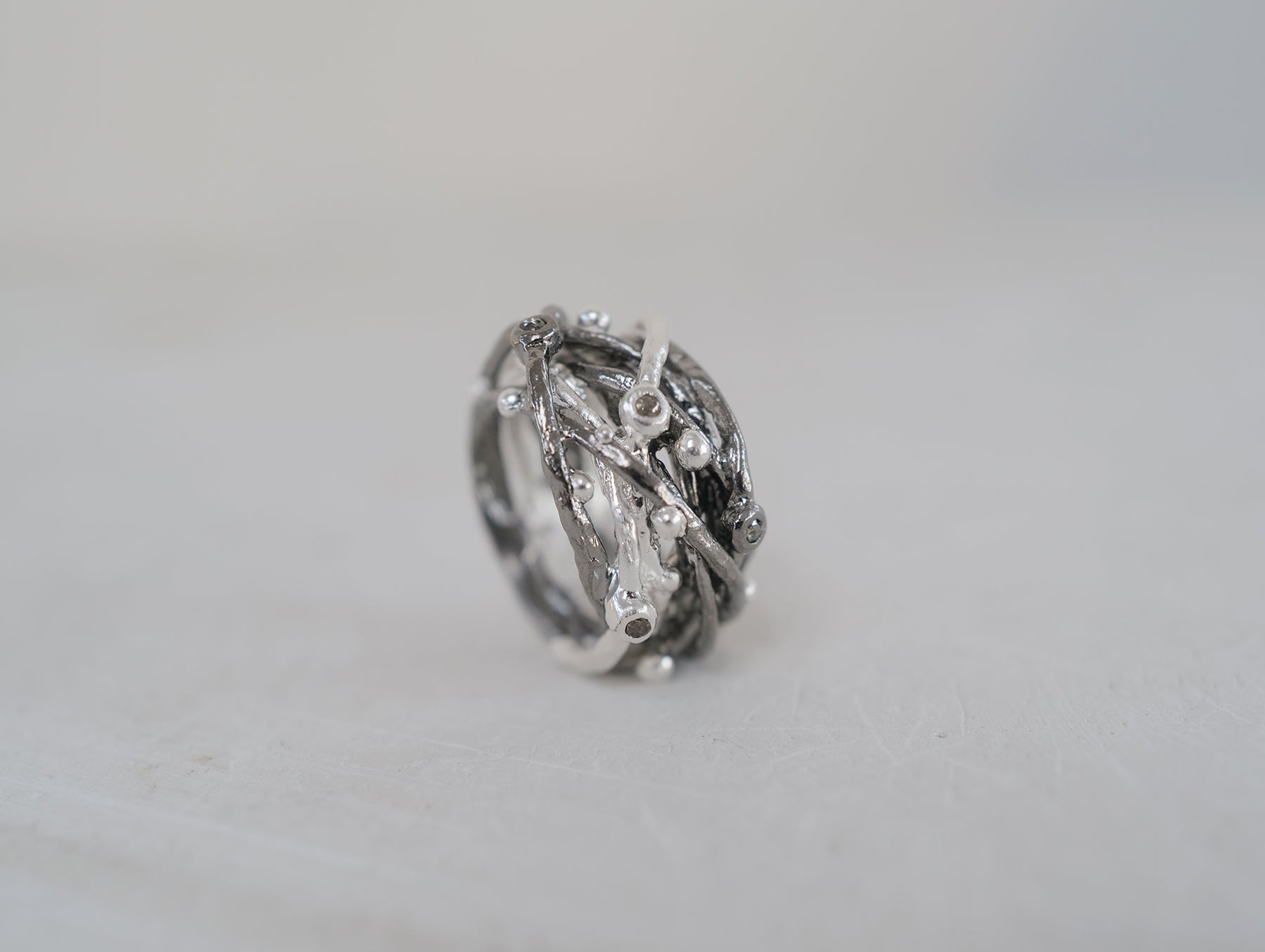 A remake of a timeless and sculptural friend from the past ring. Intertwined branches of mixed silver colors are set with four pieces of rose-cut diamonds (0,20 cts). The special version of this ring is handcrafted in 925 silver base with ruthenium plating and 925 silver.