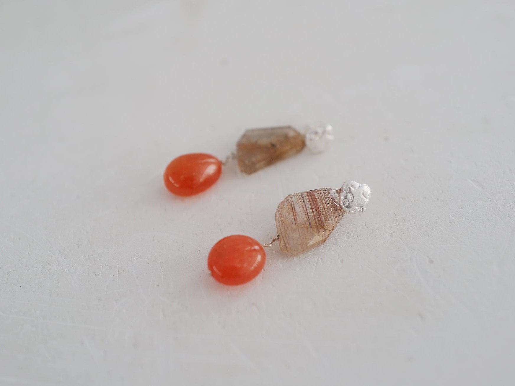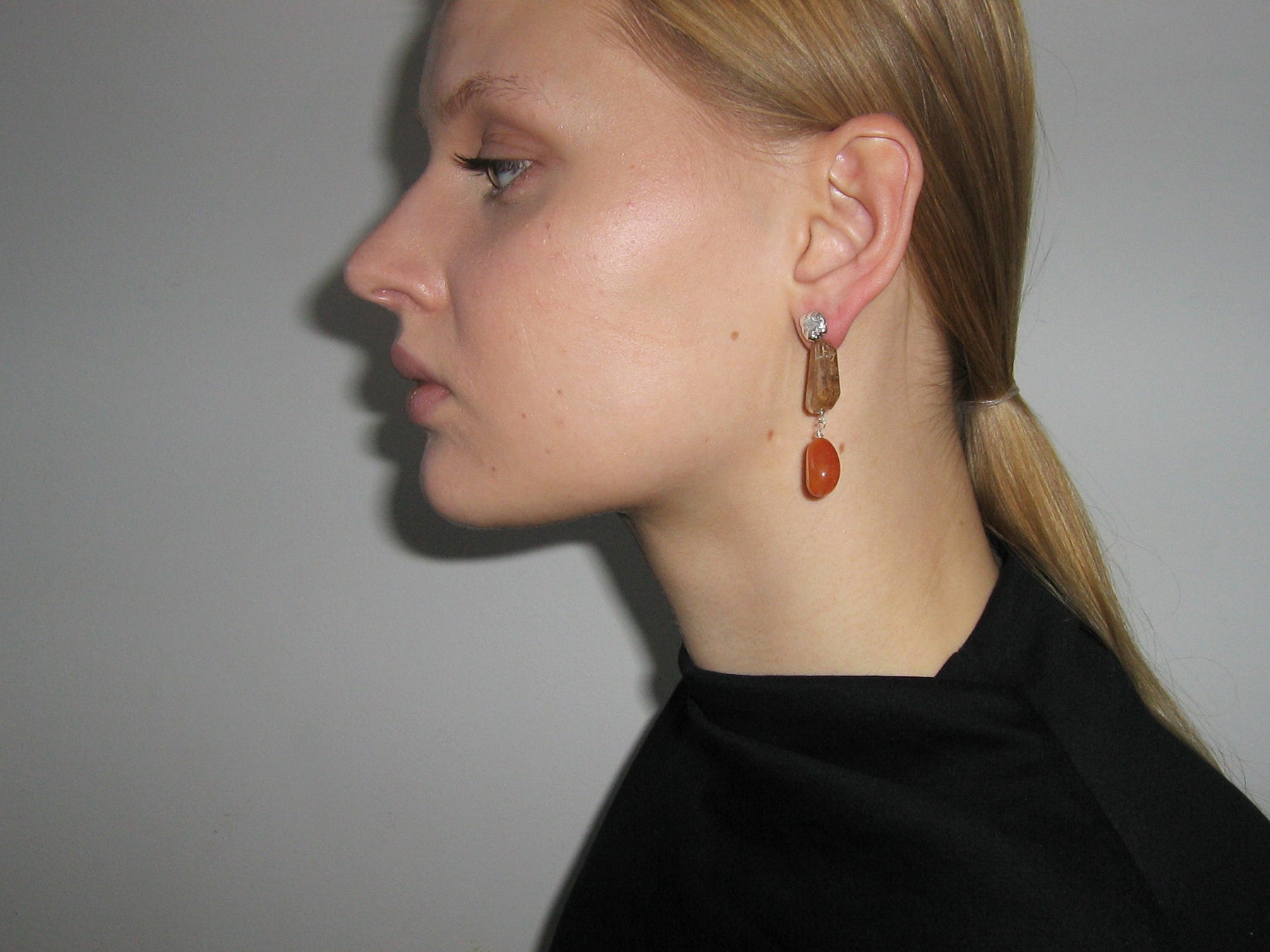One-of-a-kind drop earrings with facetted angel hair quartz and carnelian stones.