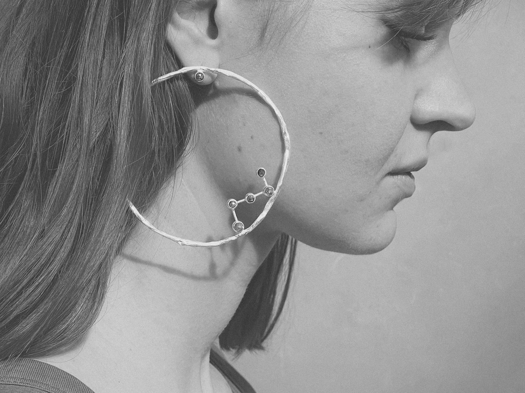 Dive into the cosmic universe with the Diamond constellation hoops. The large statement ear hoops are crafted in in 925 silver with 12 rose cut diamonds.