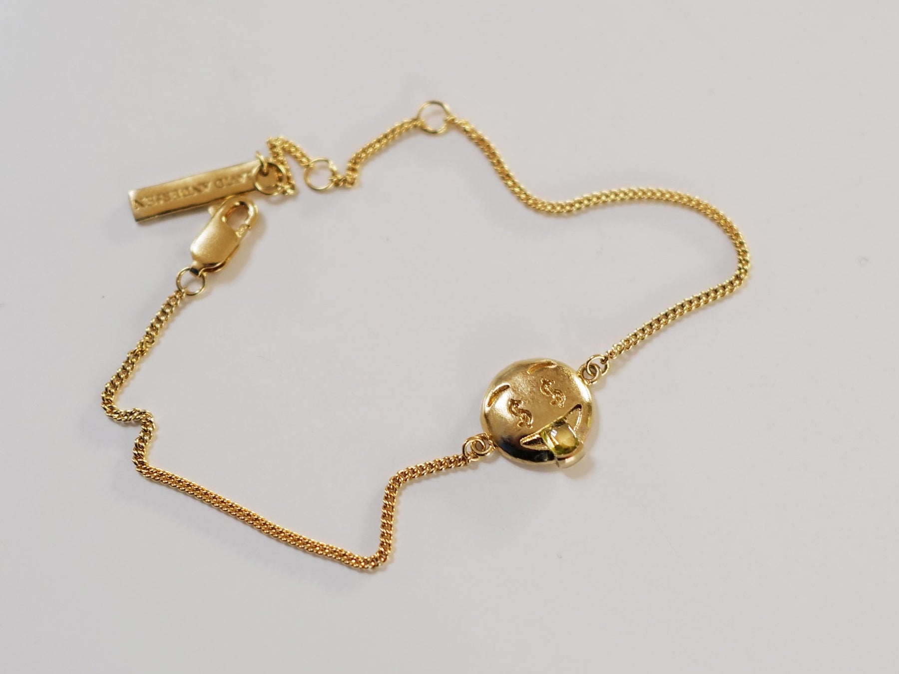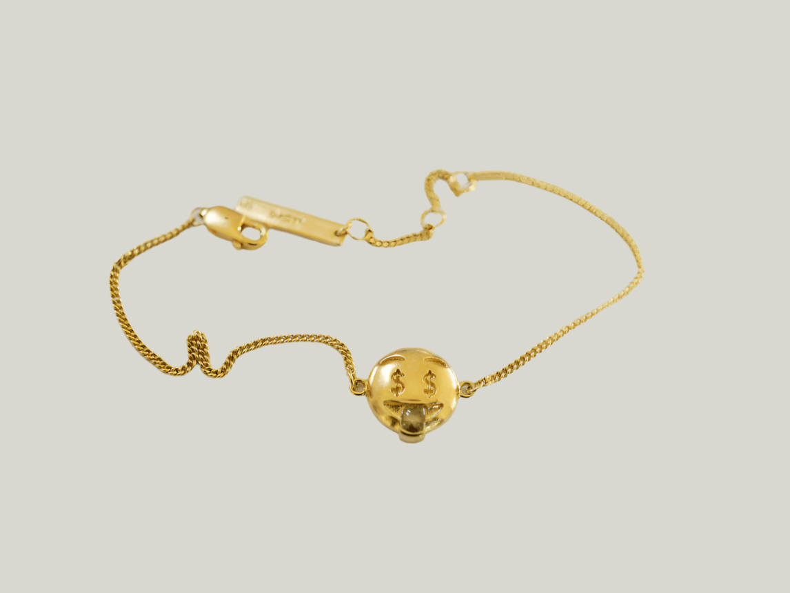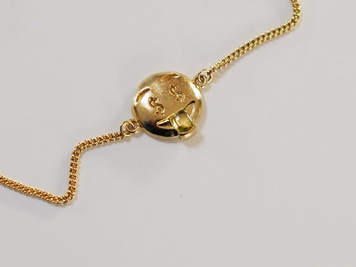 Handmade bracelet in 925 silver with 18k gold plating and one peridot gemstone set as a tongue on this special dollar emoji piece.