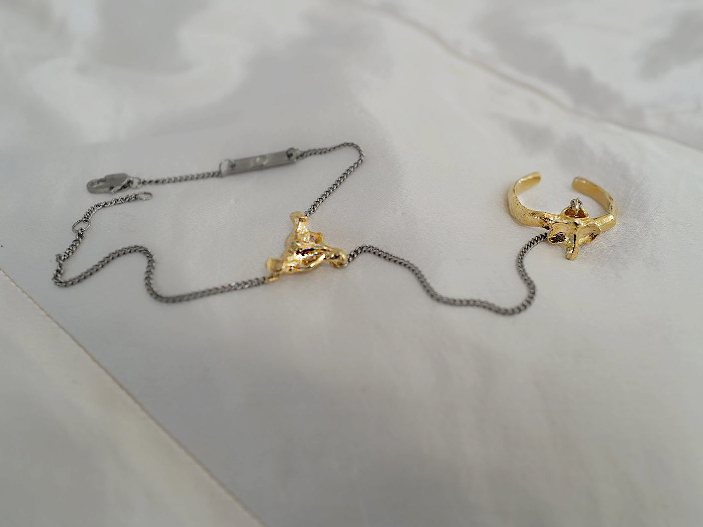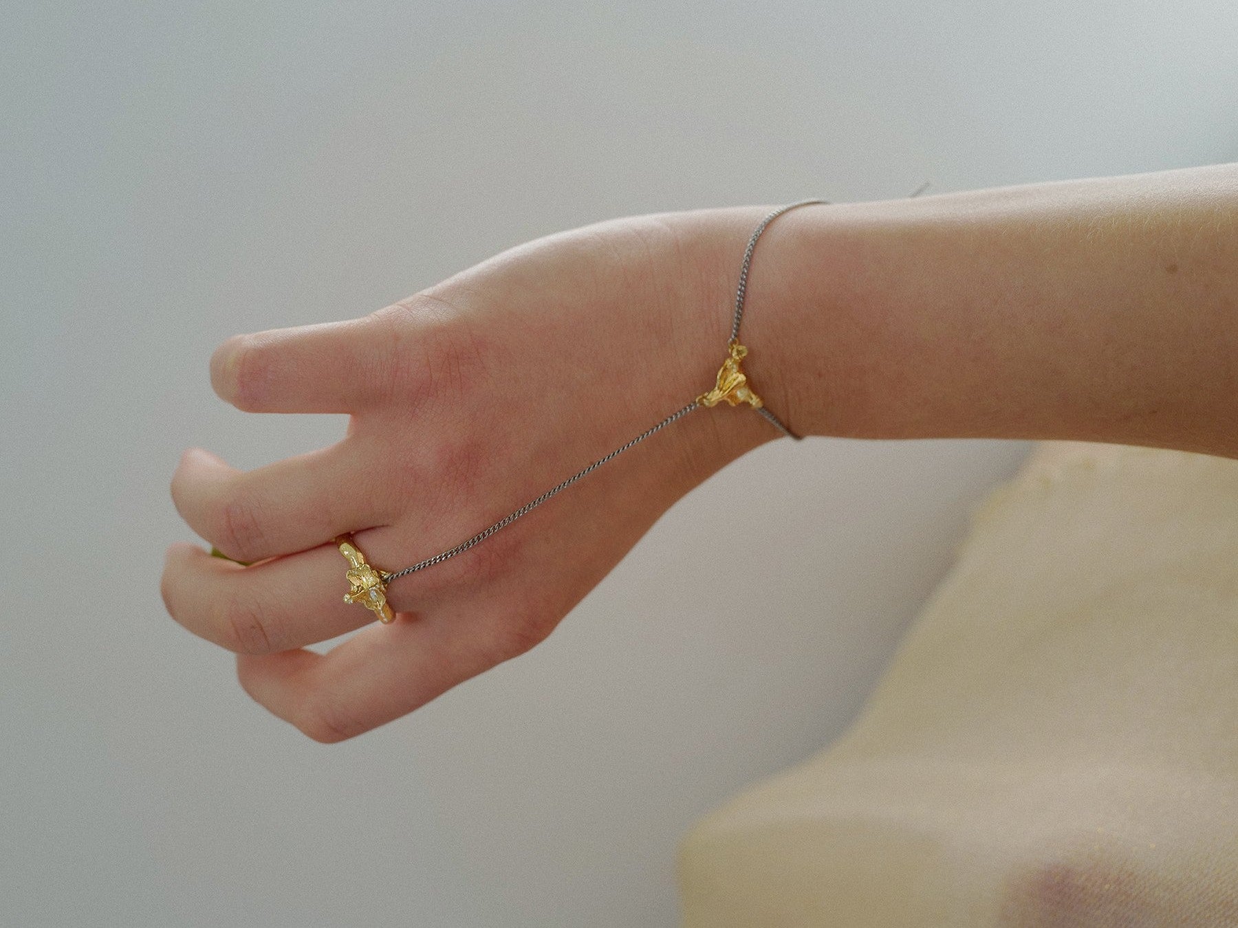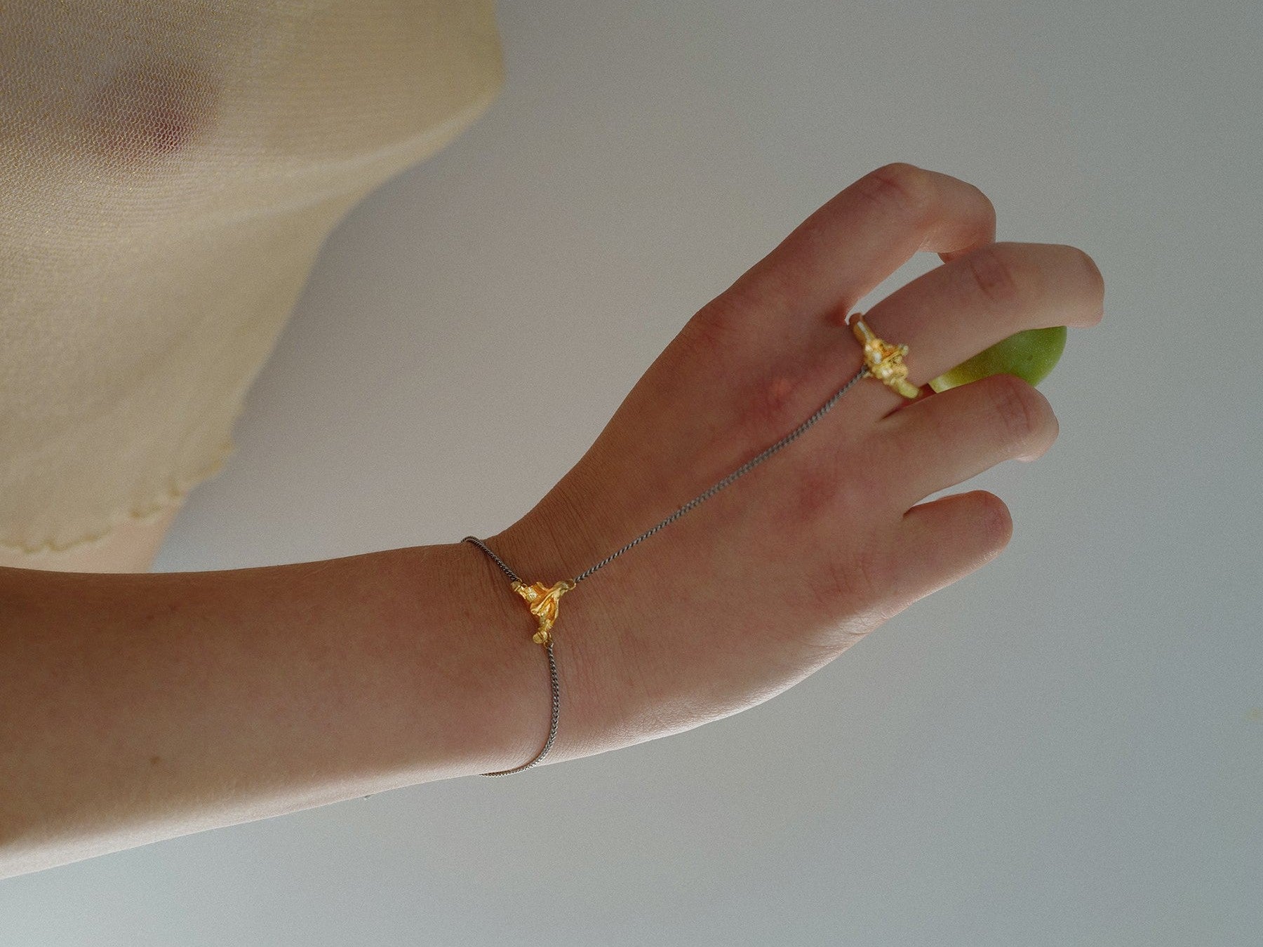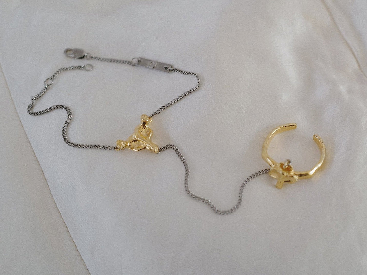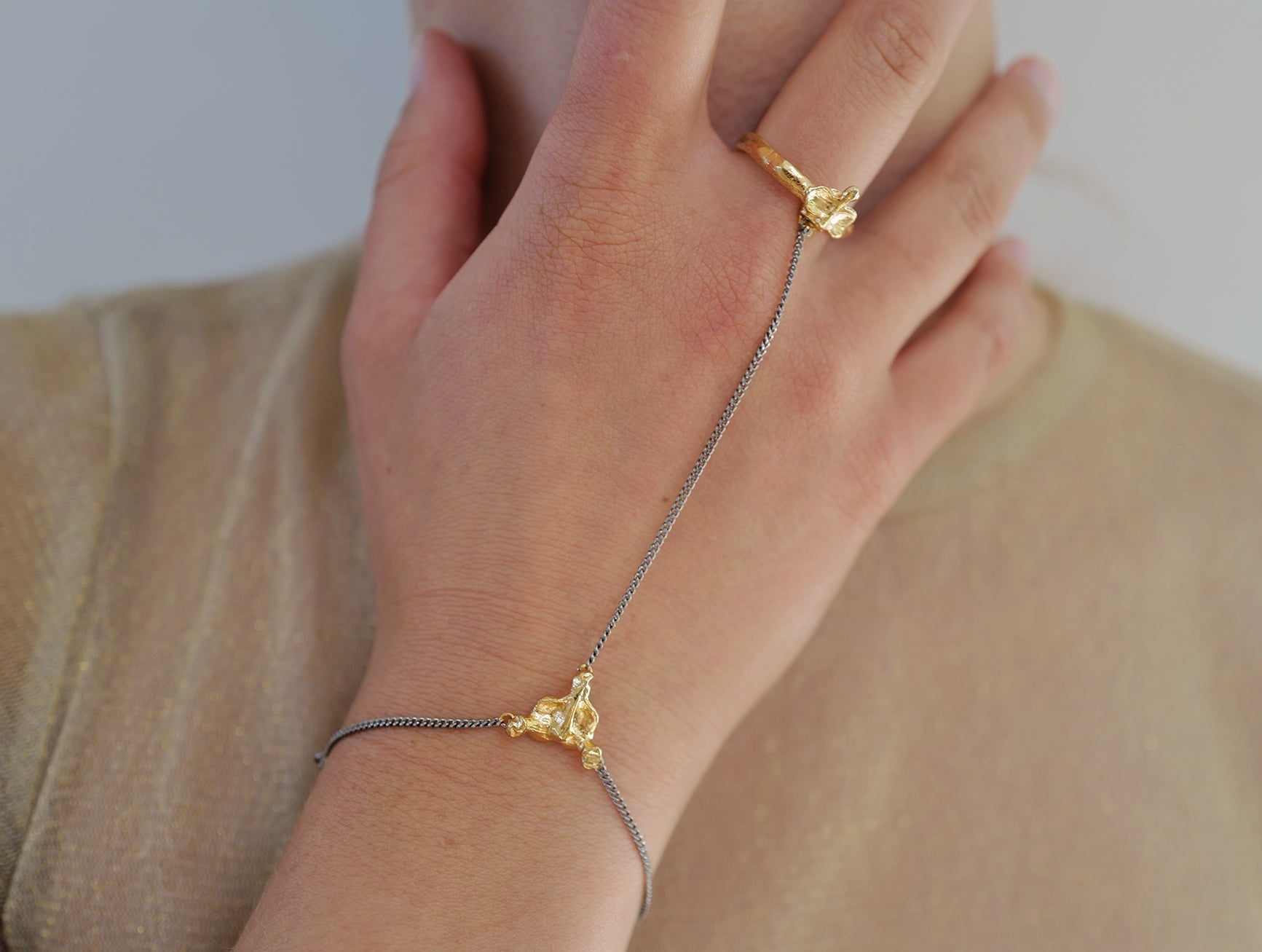 A line of 925 sterling silver links wrist to finger, anchored by abstracted spine fragments in molten 18k gold plating.