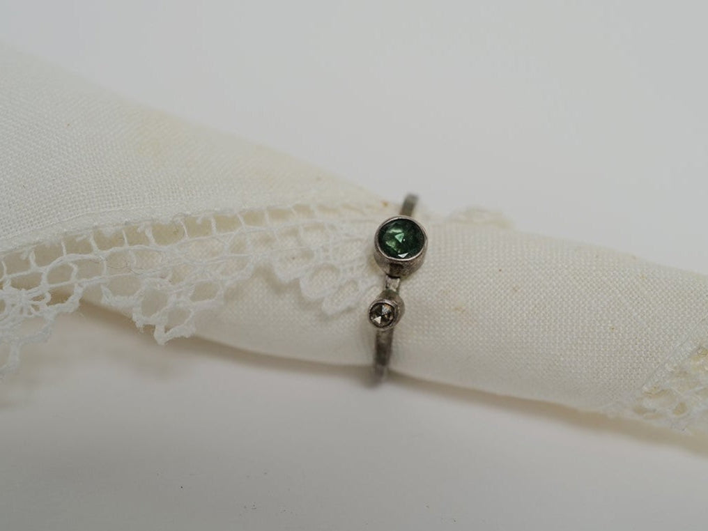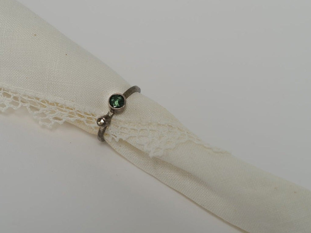 Minimalist love ring crafted in 925 black silver, set with a faceted green Tourmaline and a brilliant diamond.