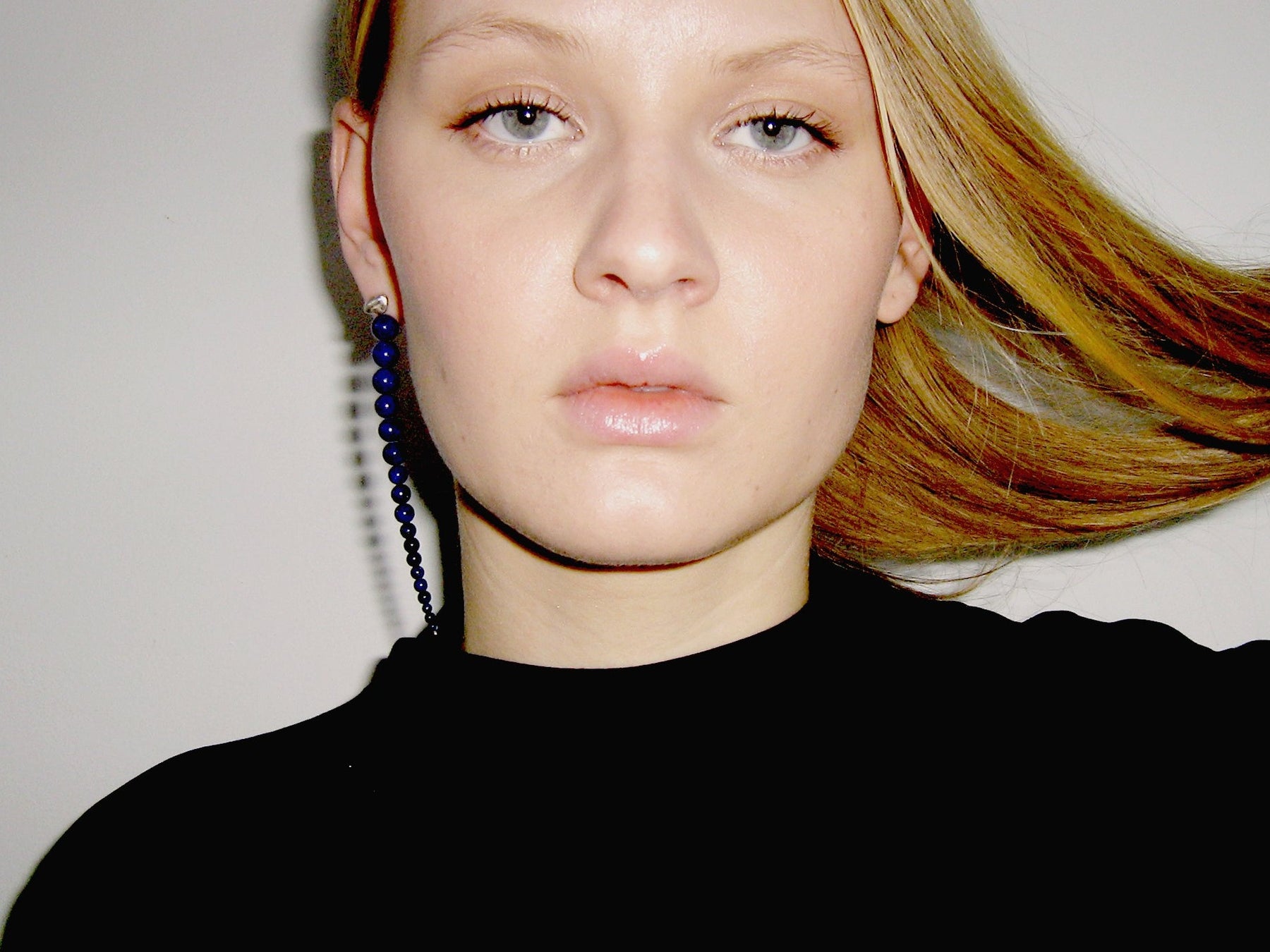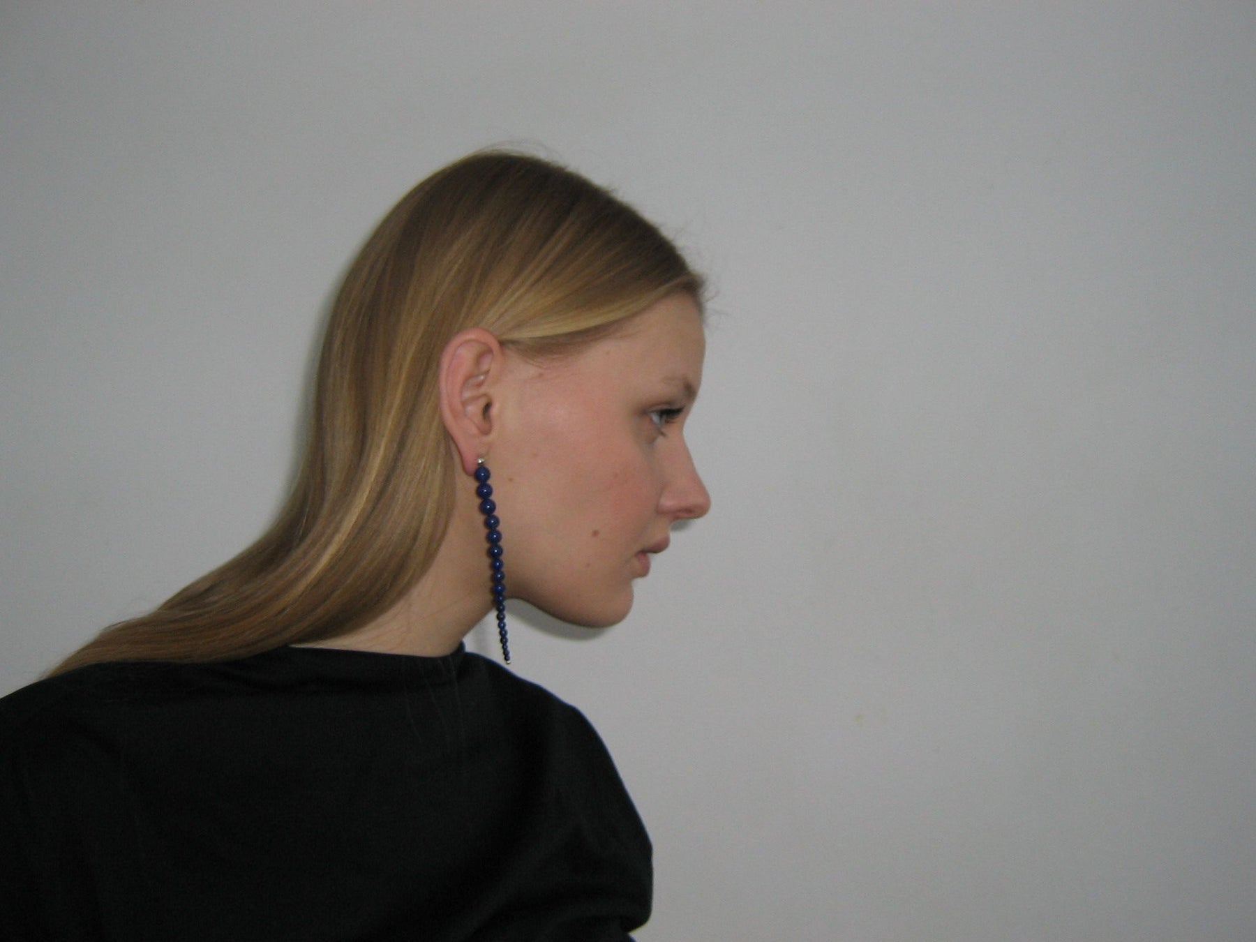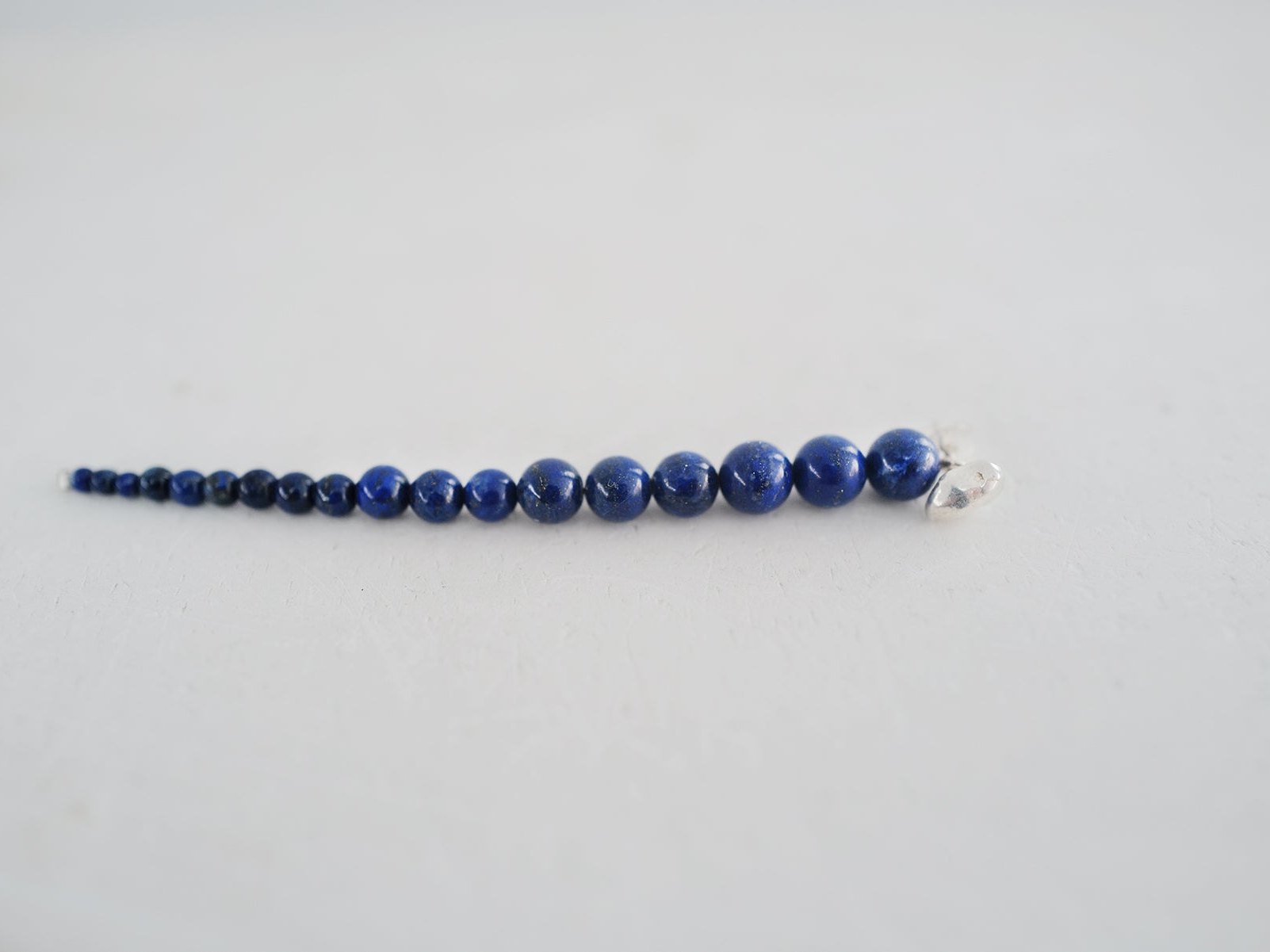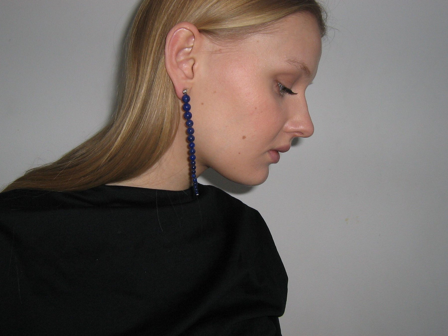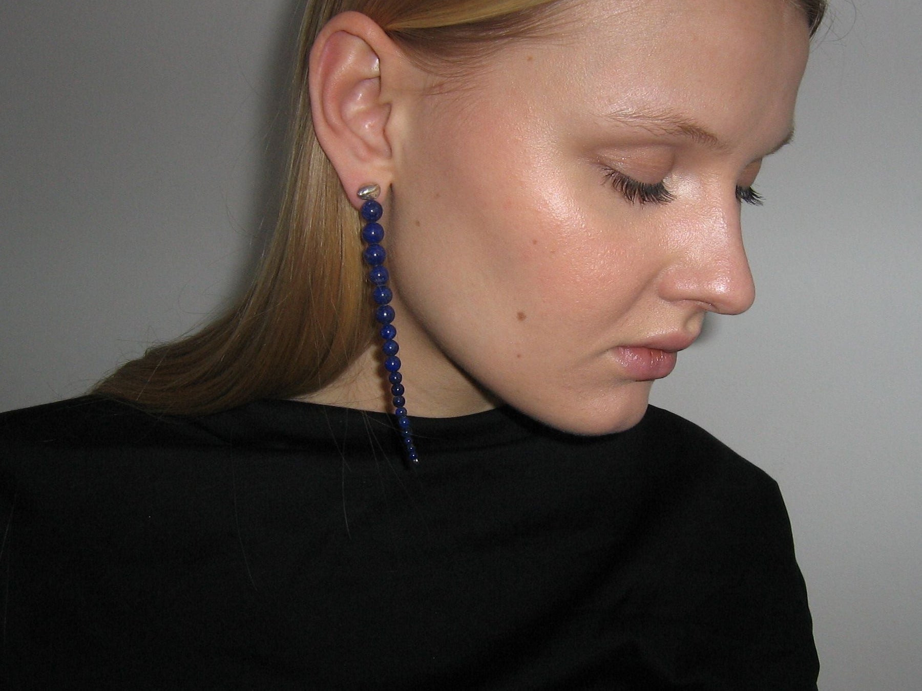 Hand beaded earpiece made up of polished Lapis Lazuli spheres of graded sizes. Metal elements and stud made from 925 Sterling silver. Length: ca 10 cm.