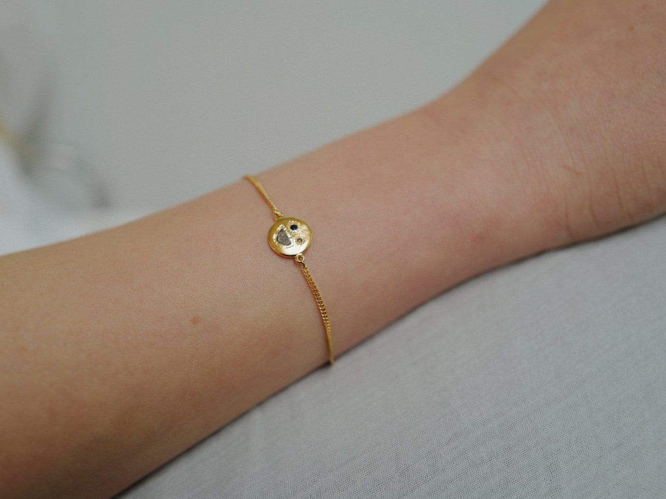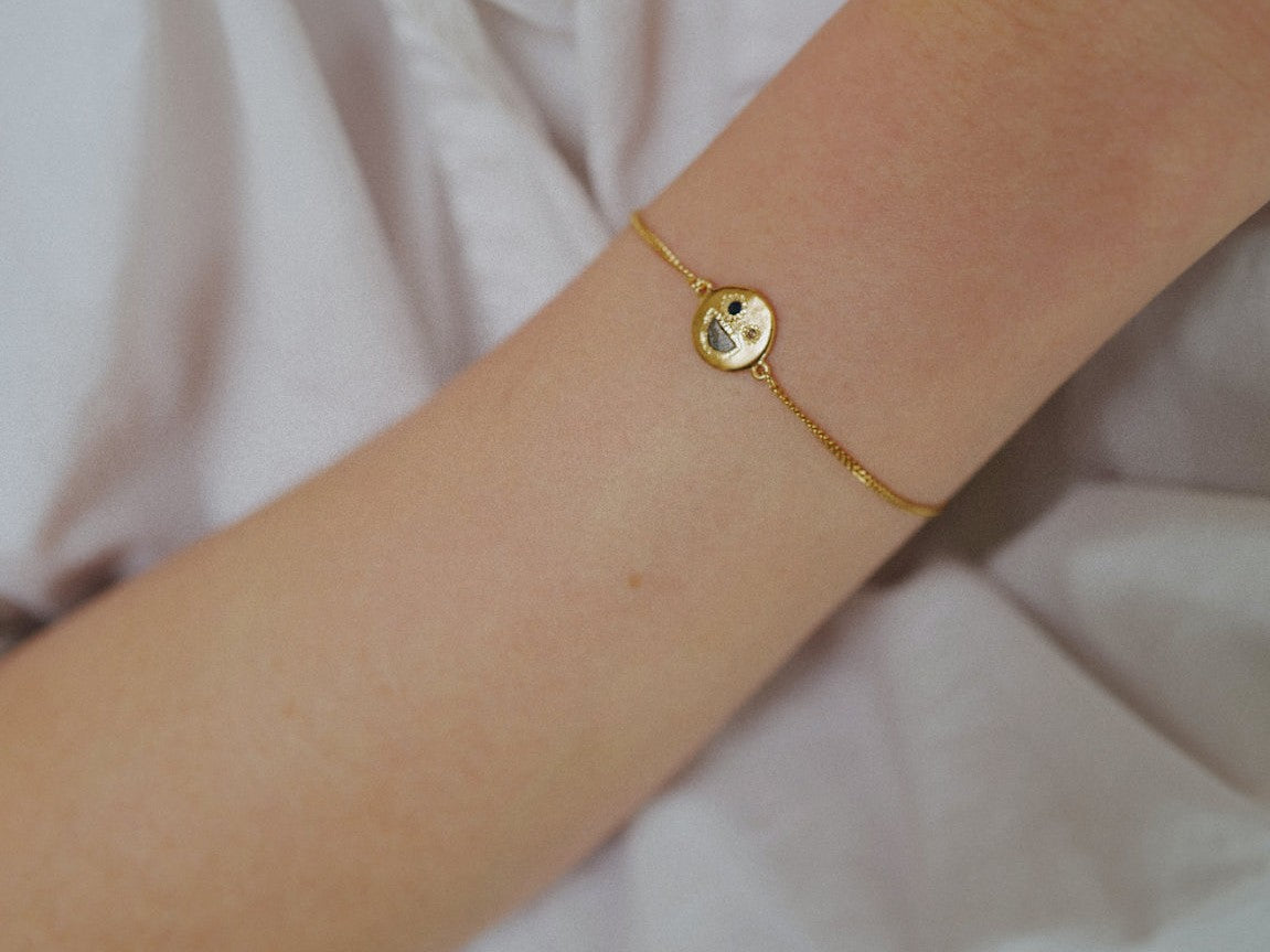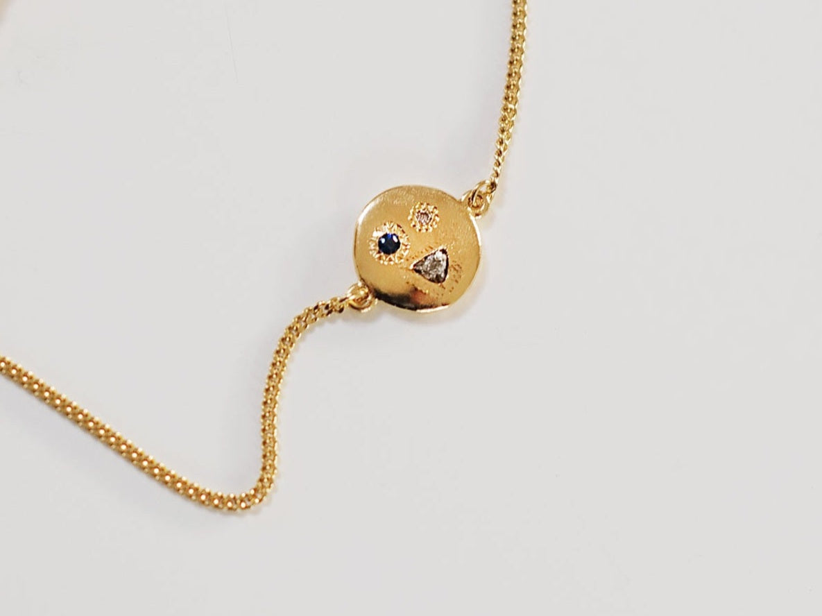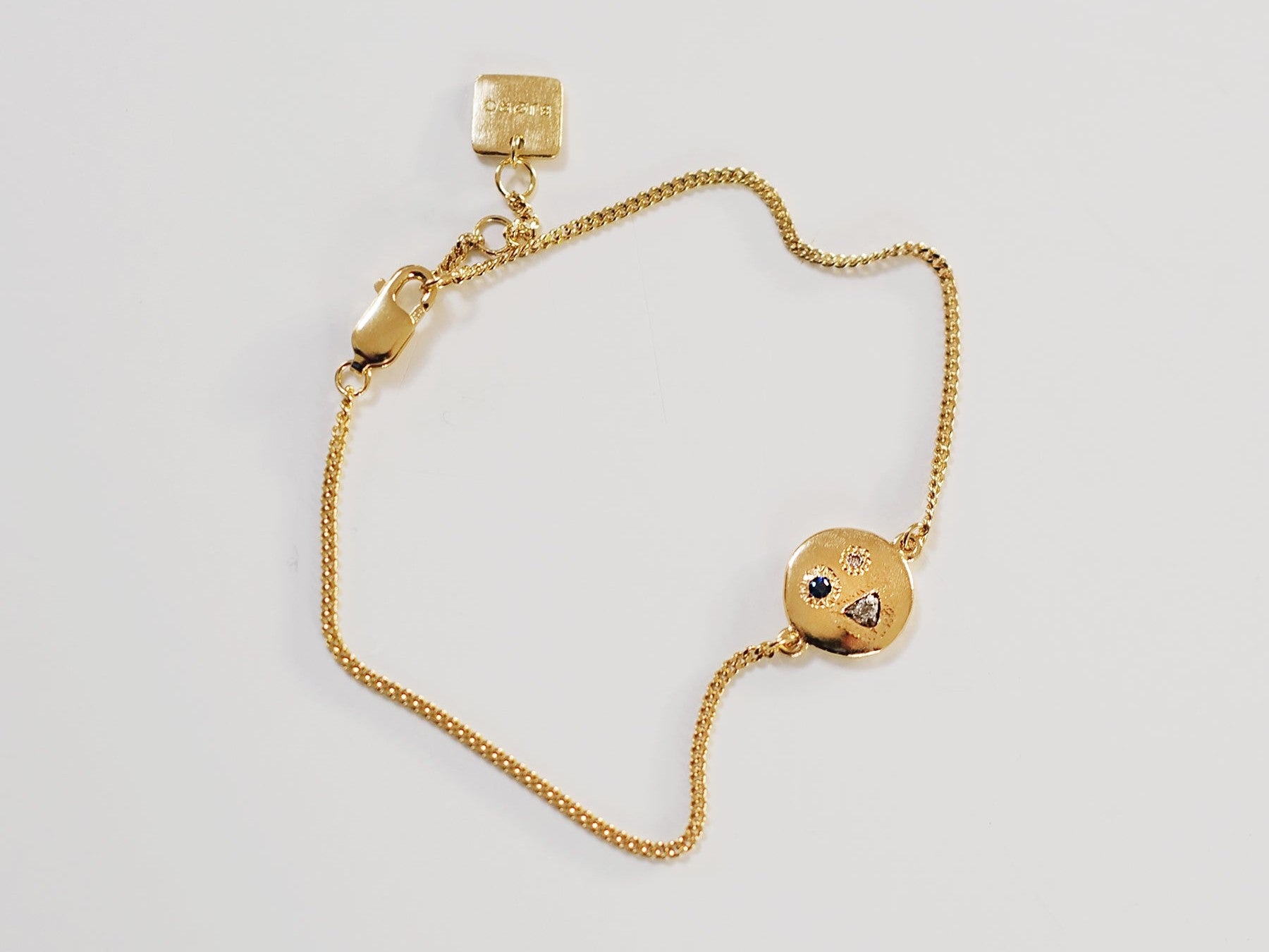 This special lucky talisman is crafted in 925 sterling silver with 18-karat gold plating. Adorned with a brilliant diamond, a mesmerizing blue sapphire, and an antique cut diamond mouth, this bracelet exudes timeless precious beauty and endless personality.