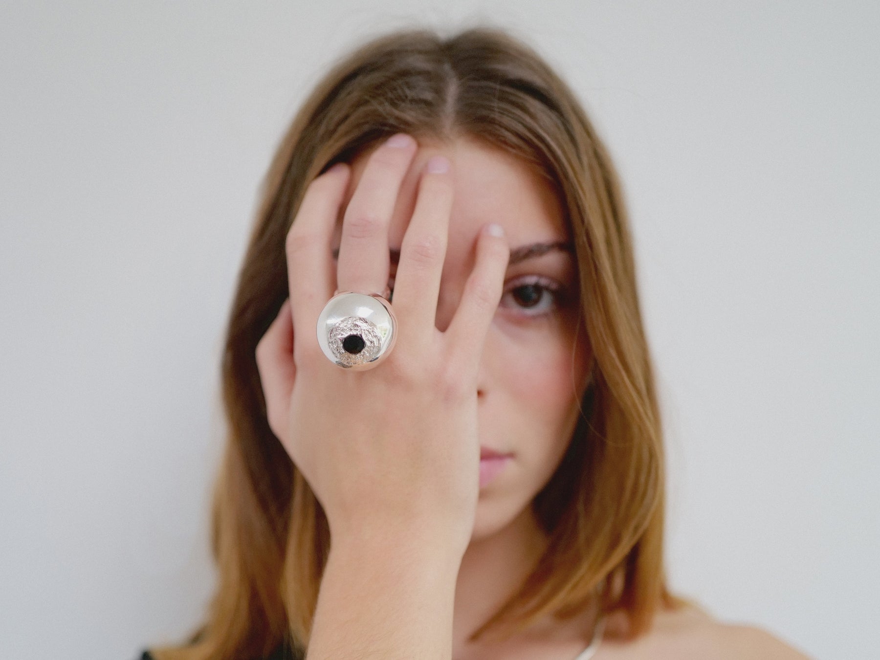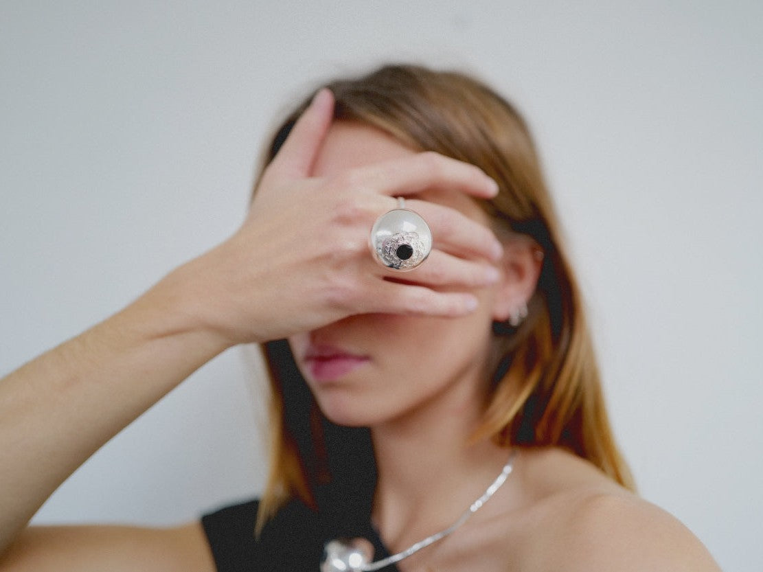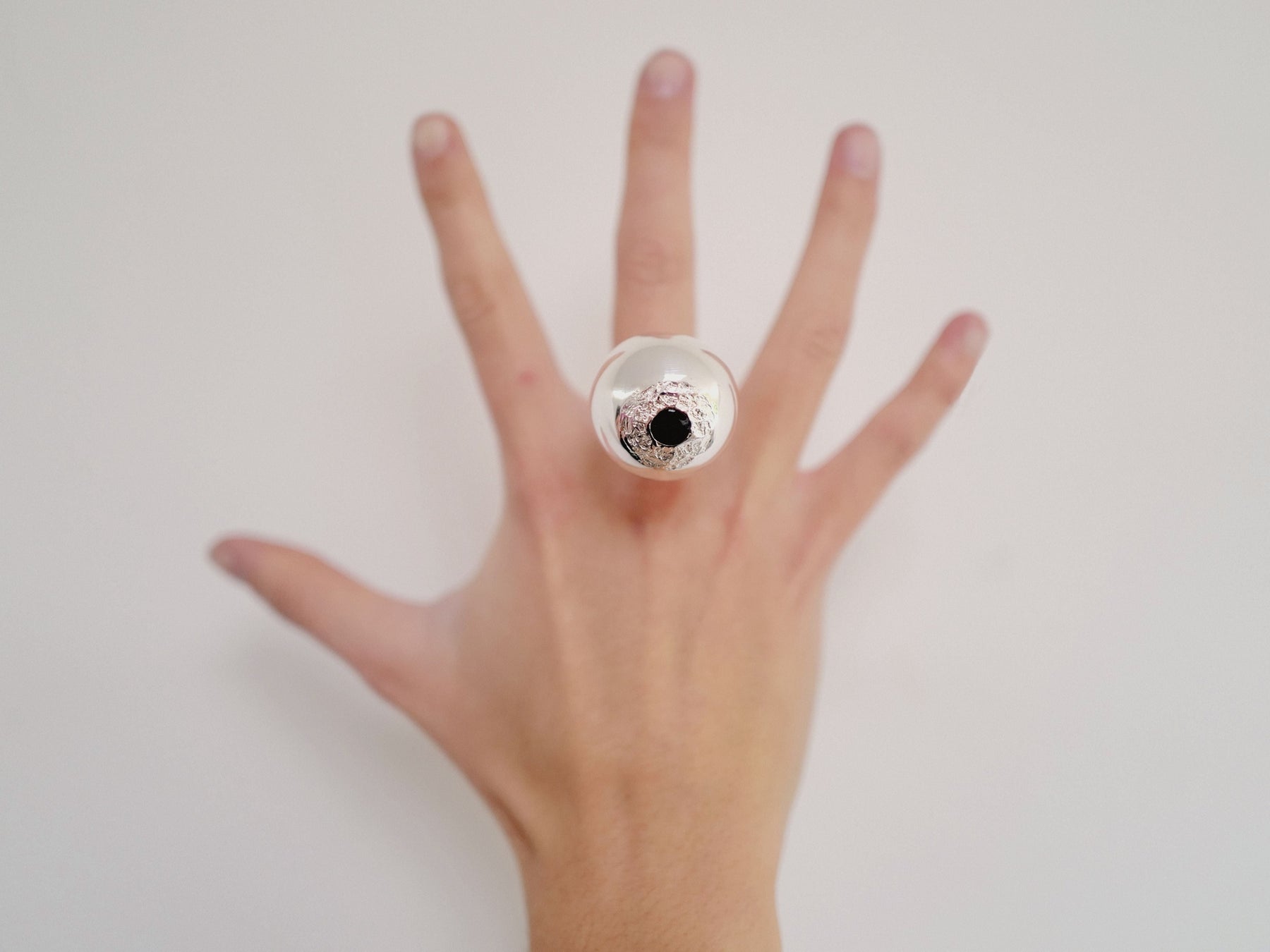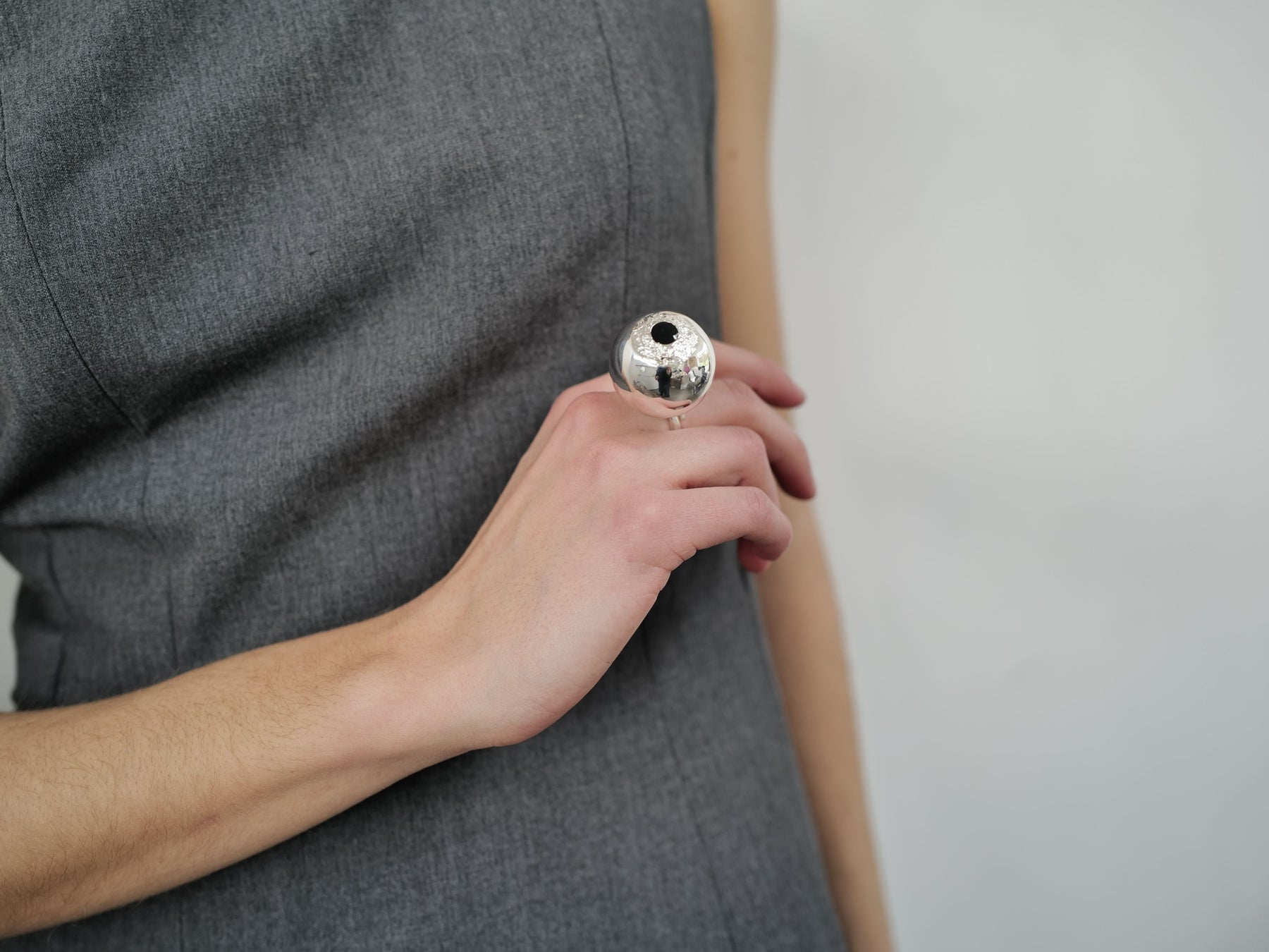 A sculptural statement piece crafted in 925 silver-plated bronze. The bold, polished sphere catches light like a distant planet, centered with a dark, textural void — a contrast between presence and mystery.