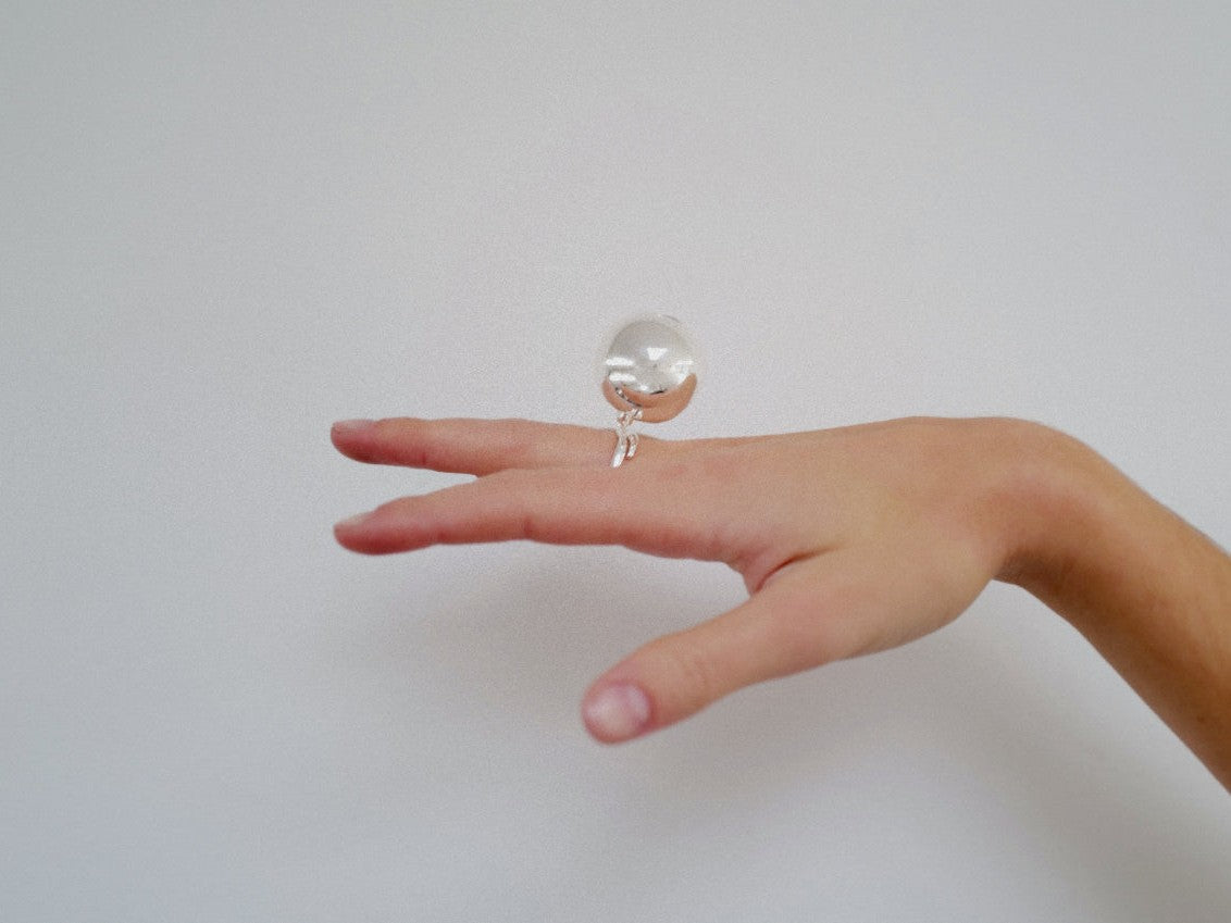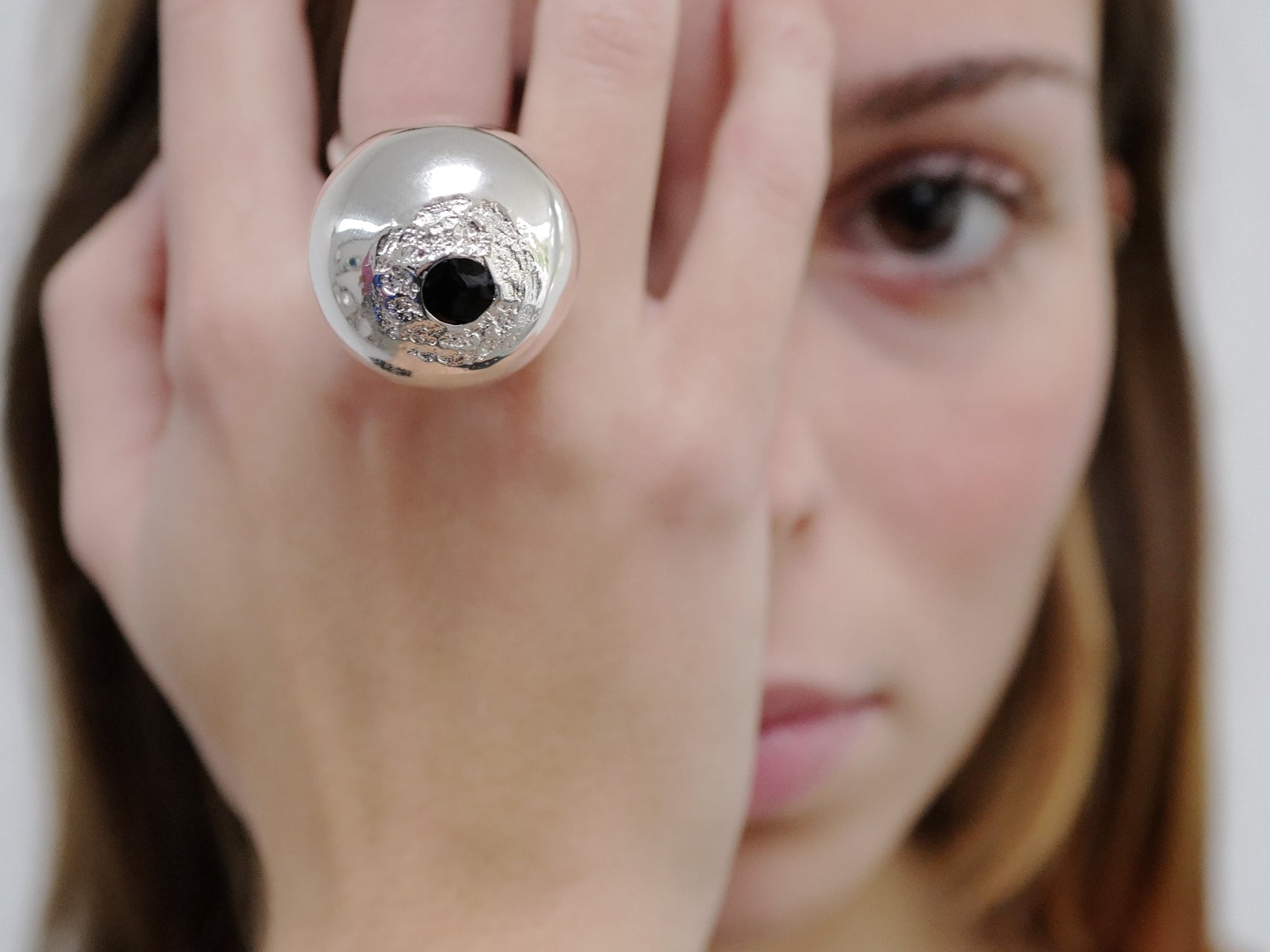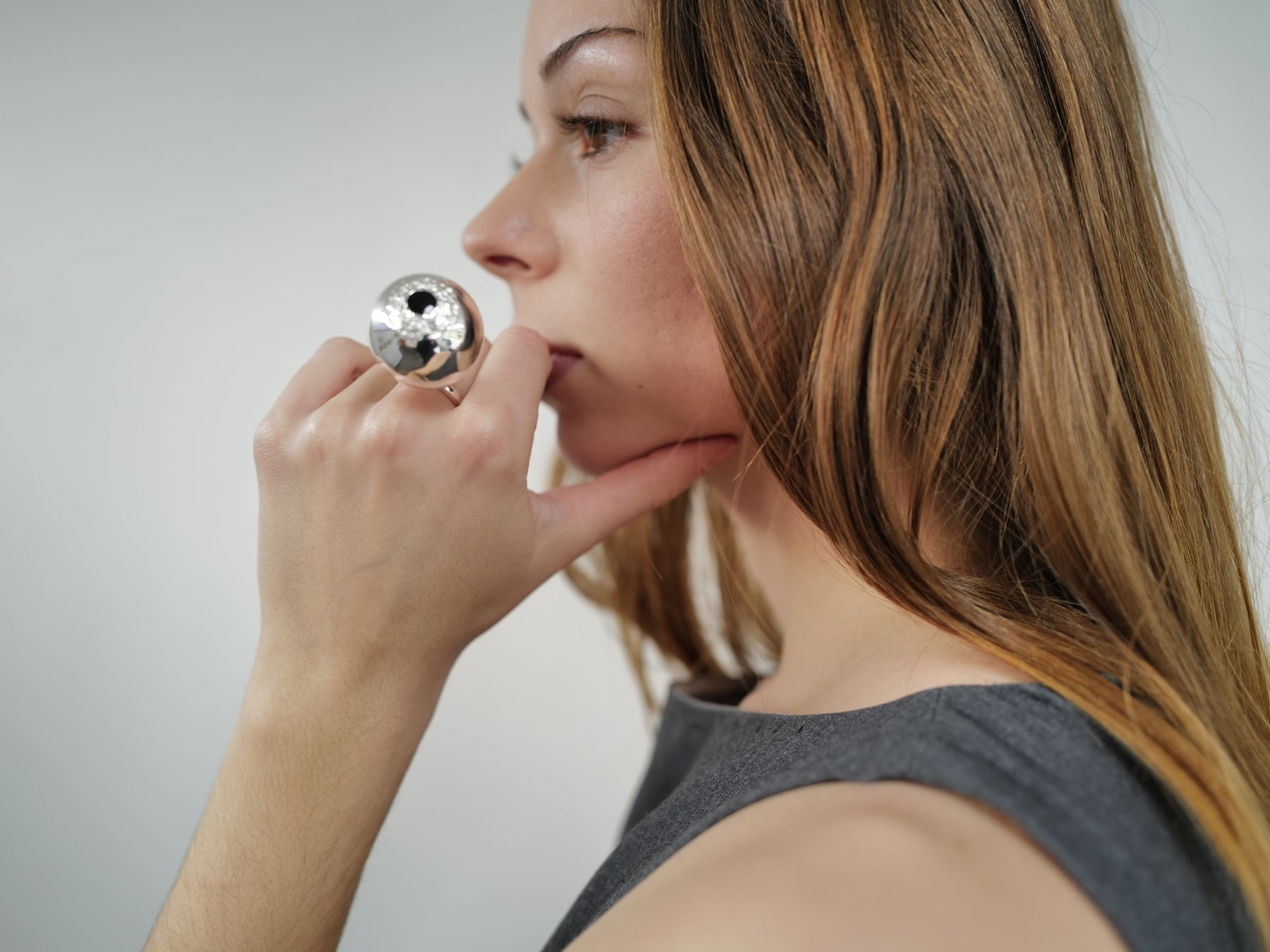 A sculptural statement piece crafted in 925 silver-plated bronze. The bold, polished sphere catches light like a distant planet, centered with a dark, textural void — a contrast between presence and mystery.