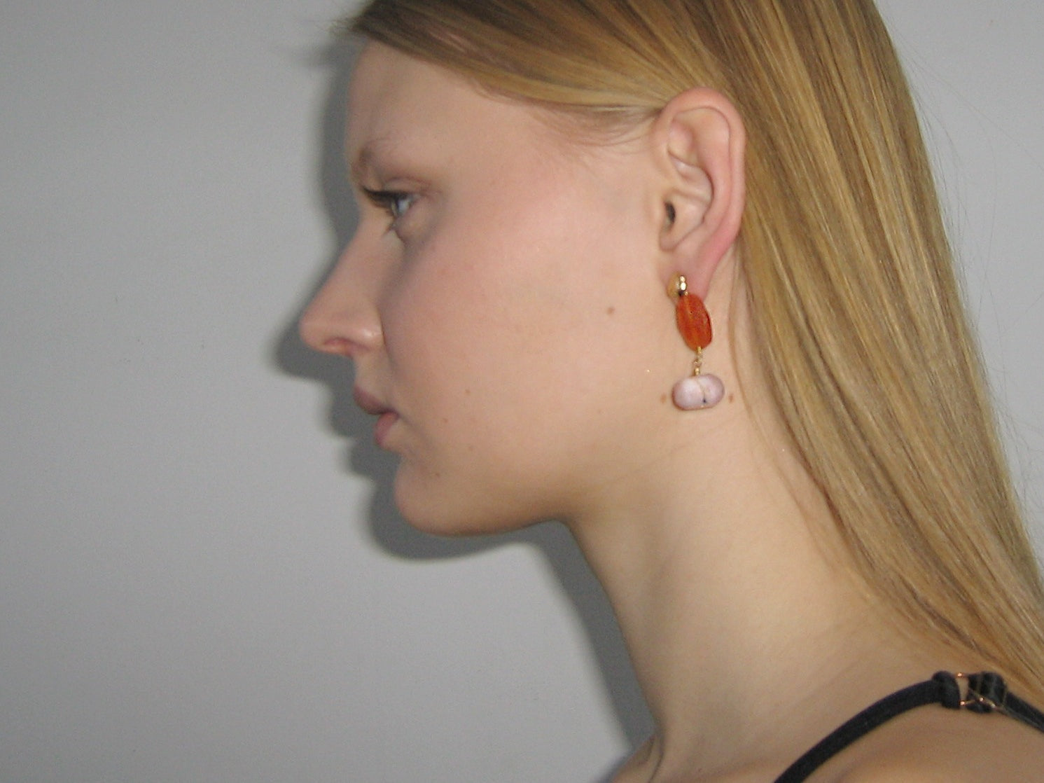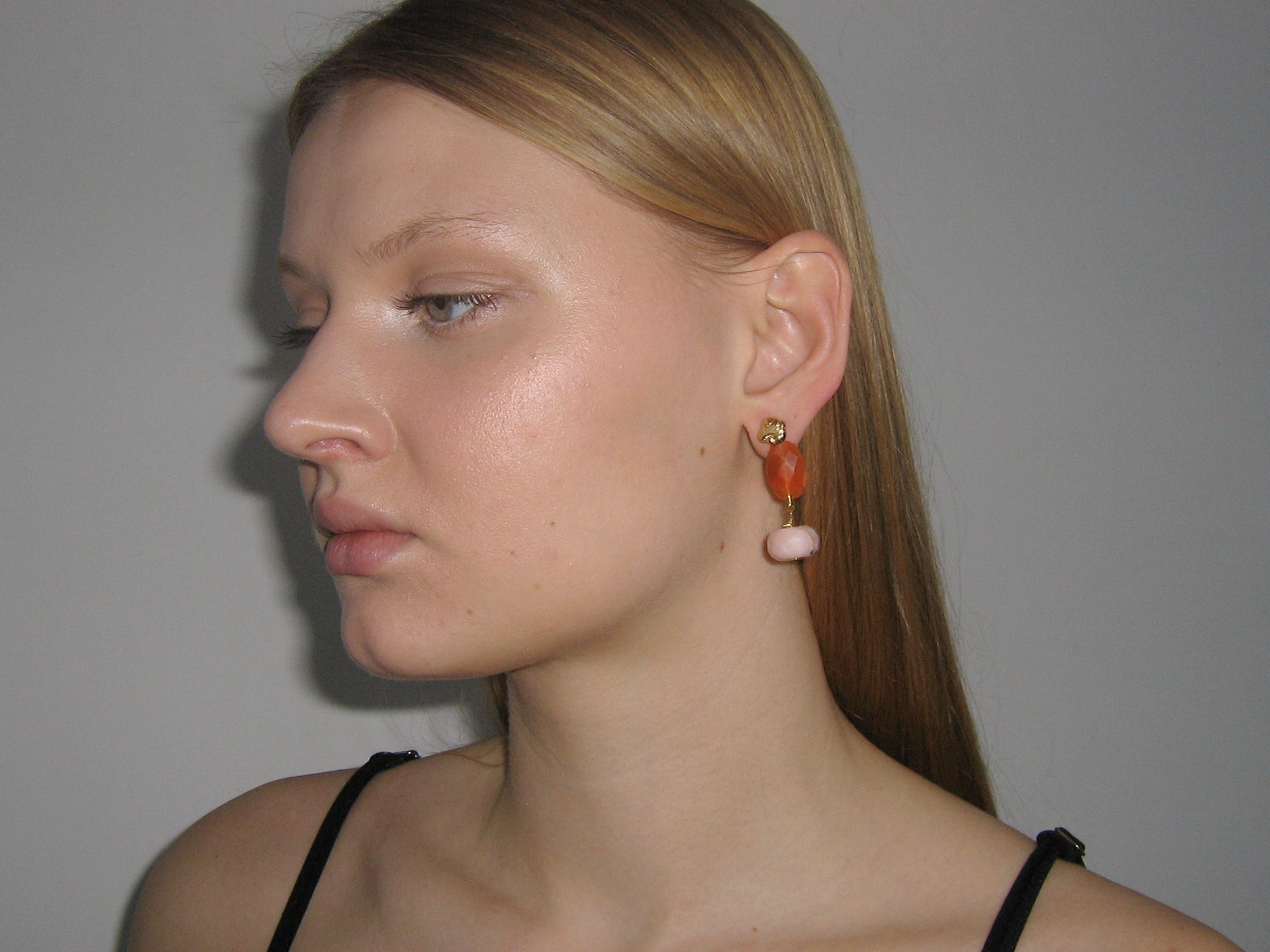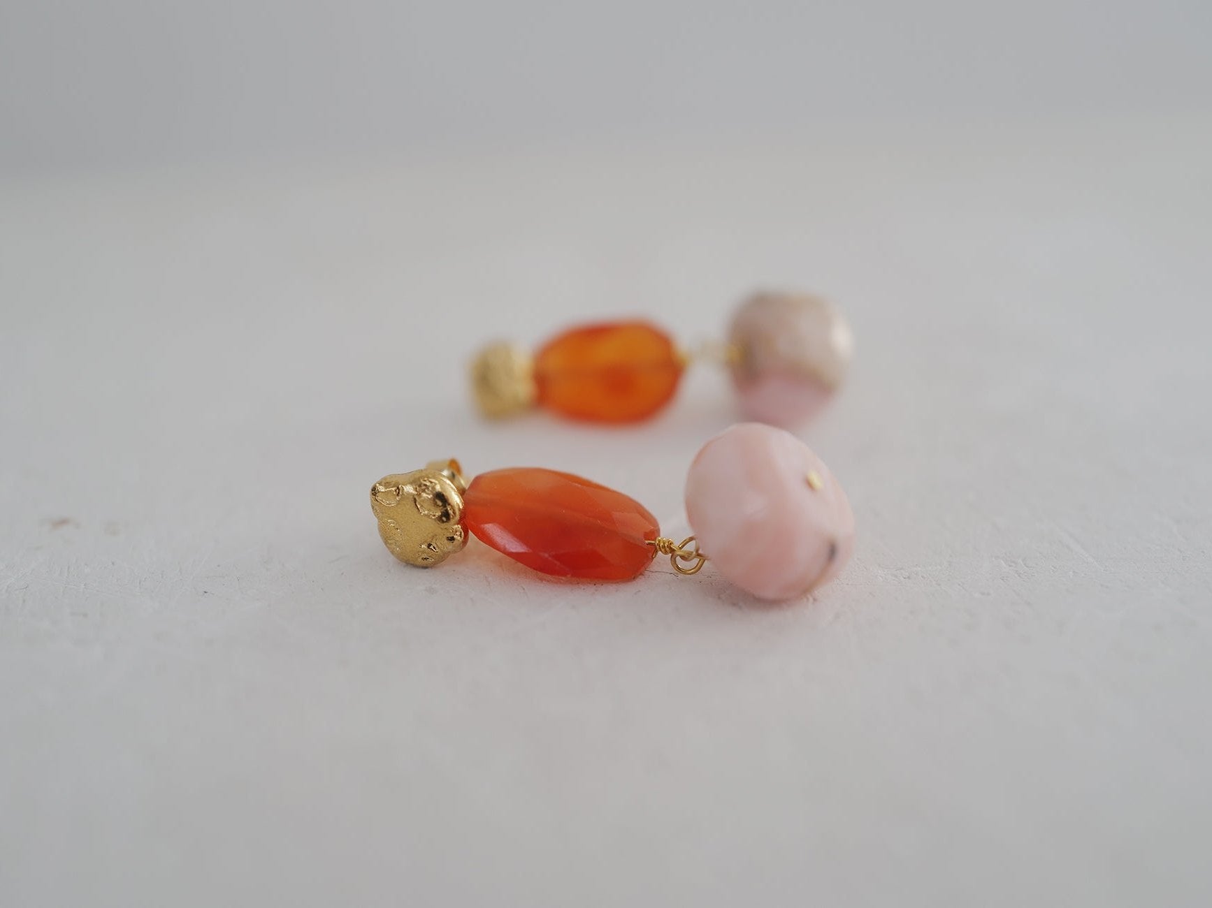 Handmade and unique 925 silver ear studs are adorned with bright orange Carnelian and Pink Opal stones.