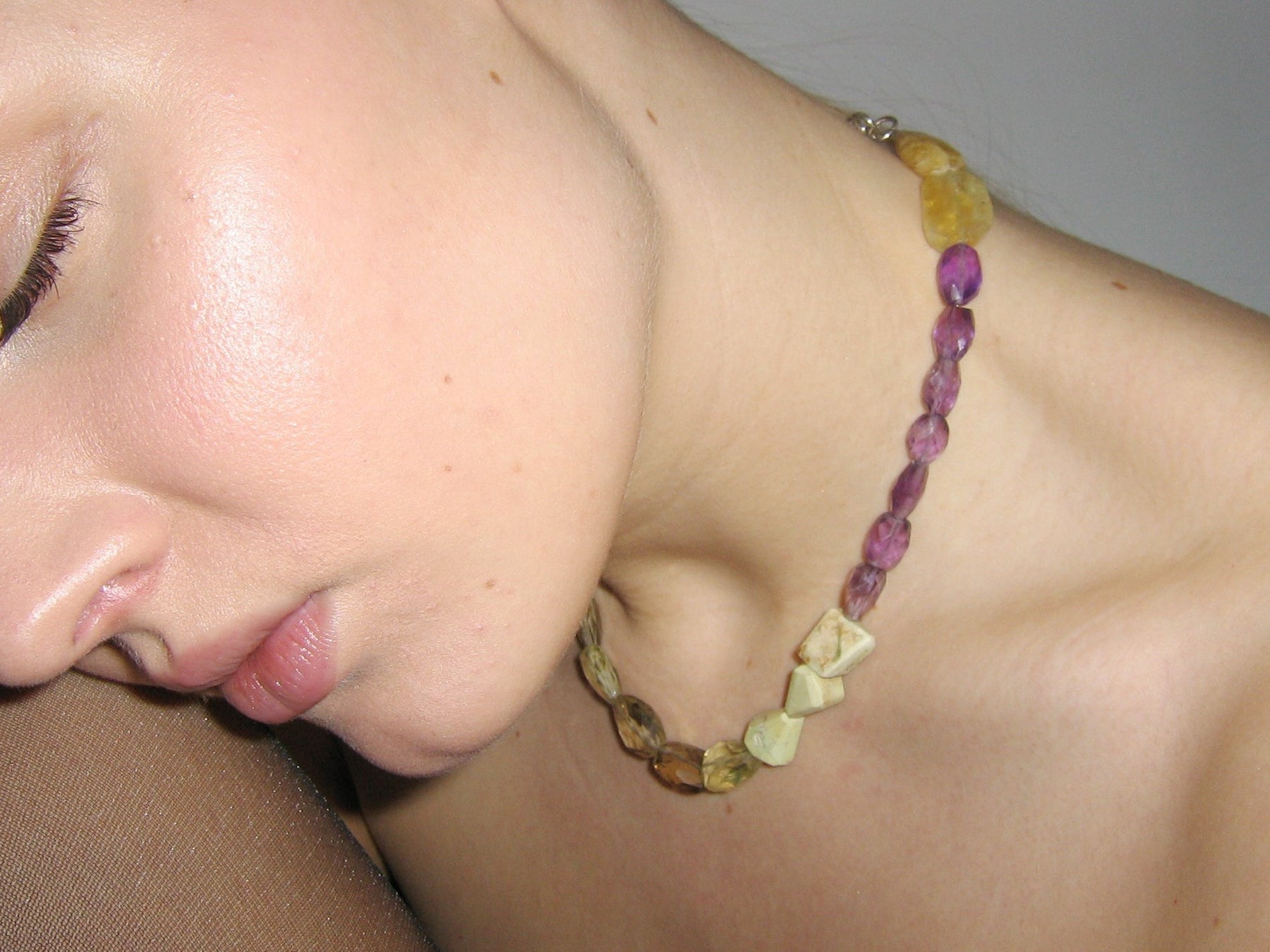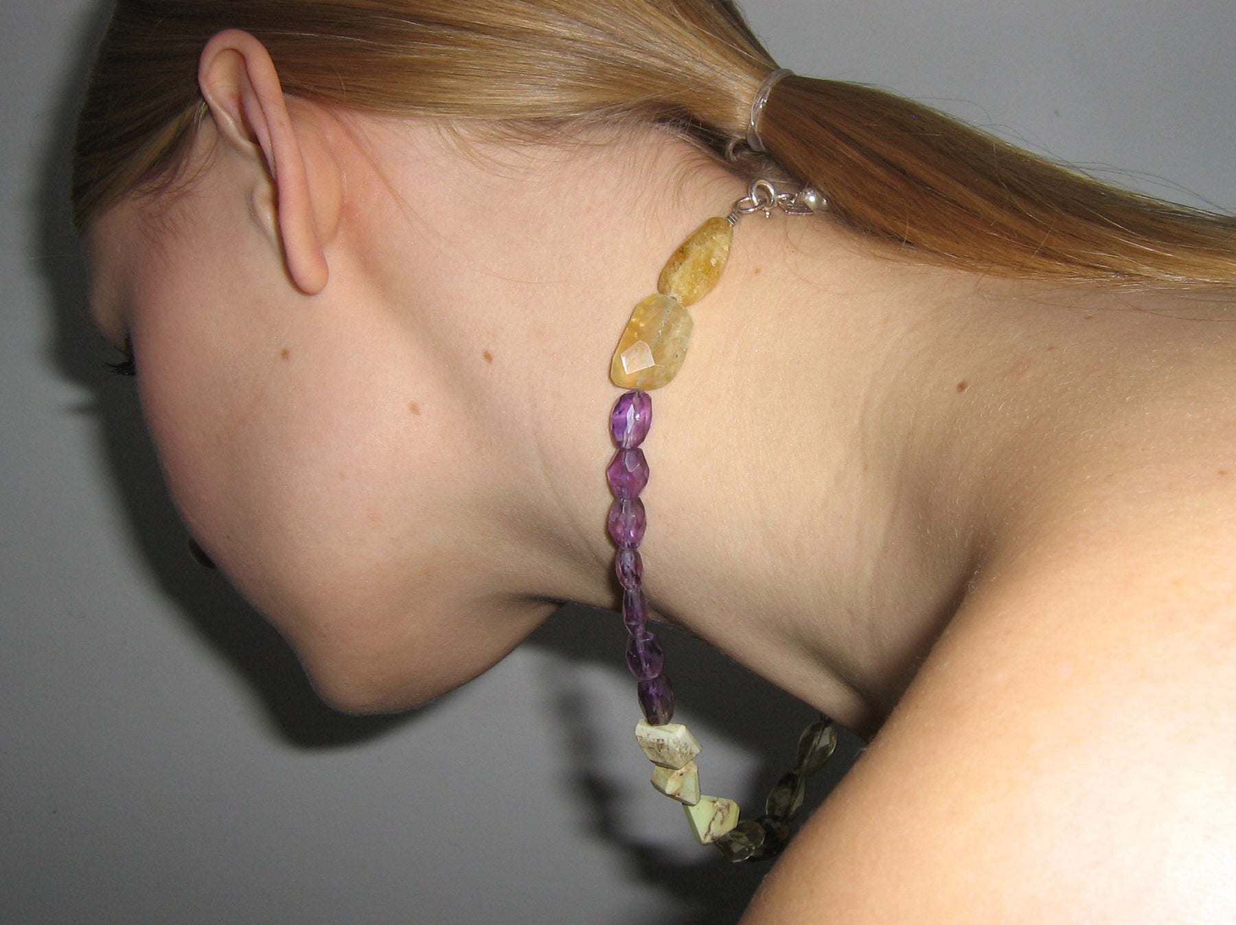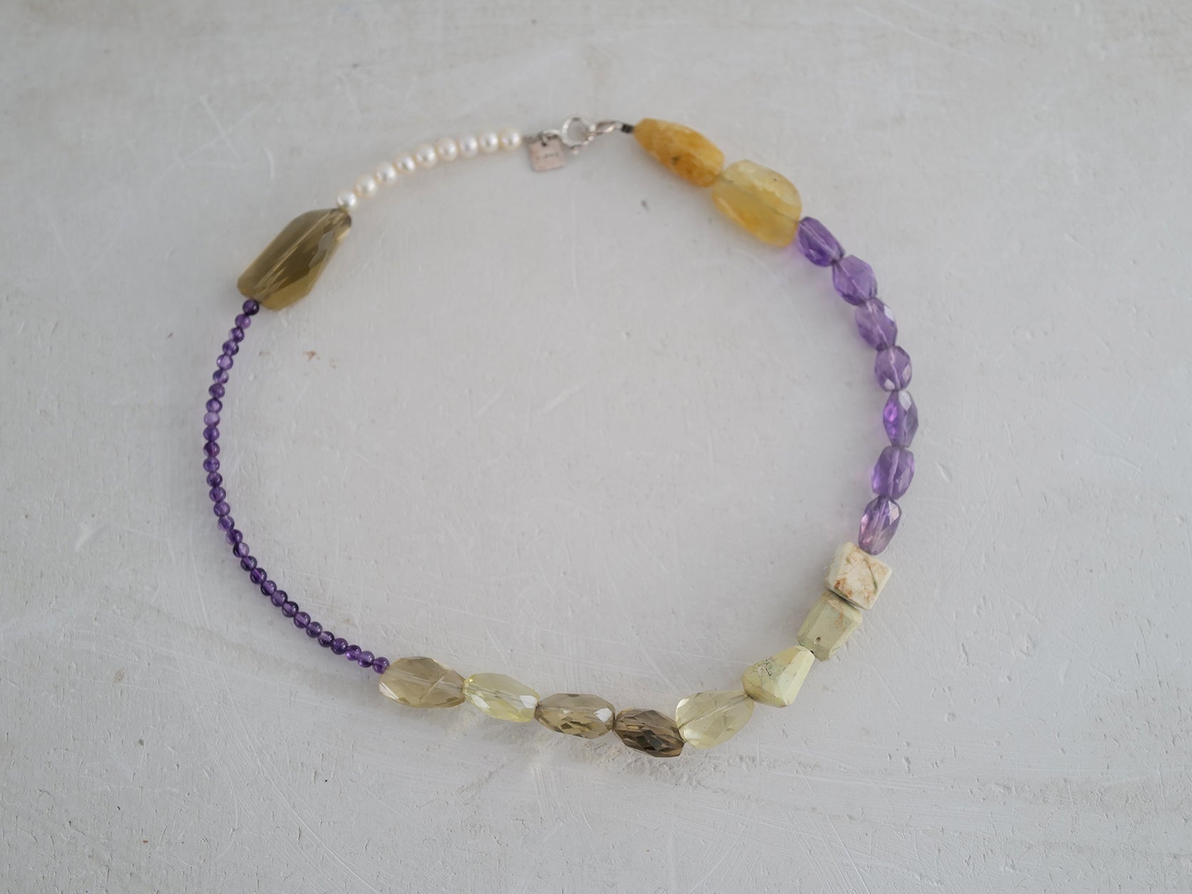 Stones: Smoky Topaz, Amethyst, Lemon Quartz, Chrysocola, Fluorite, Yellow Beryl and freshwater Pearl