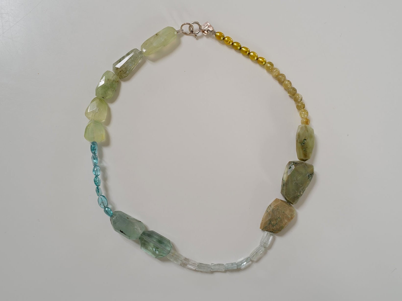 A vibrant mix of aquamarine, apatite,freshwater pearls and opal in varying shapes — some polished to a smooth glow, others cut to catch the light.