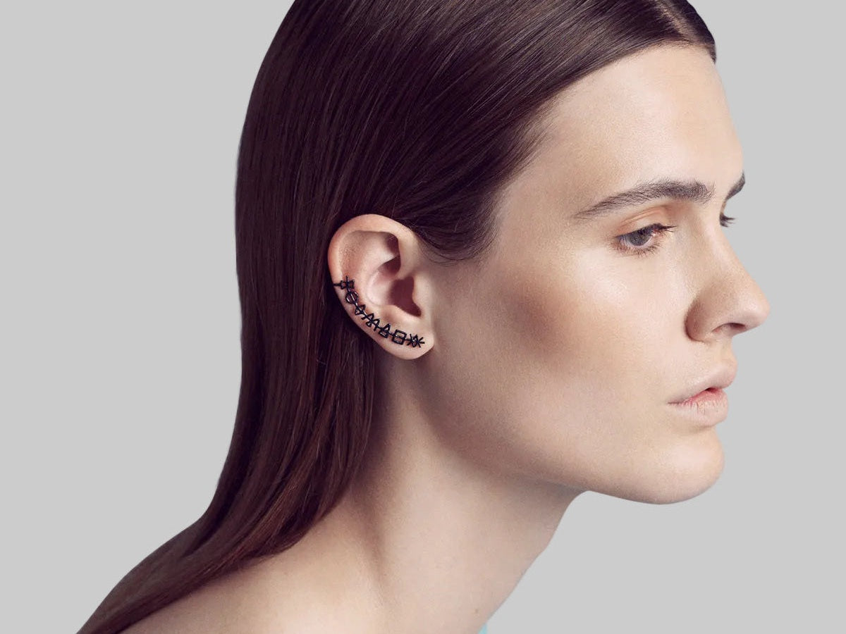A singular silver earring shaped like a subtle suture along the ear.