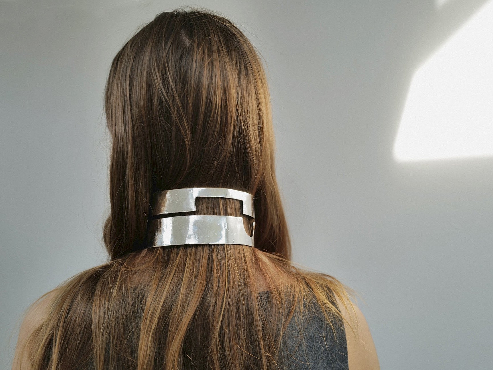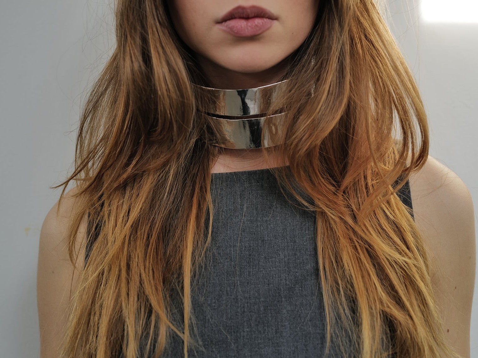 A bold, sculptural choker crafted in highly polished silver-plated bronze.