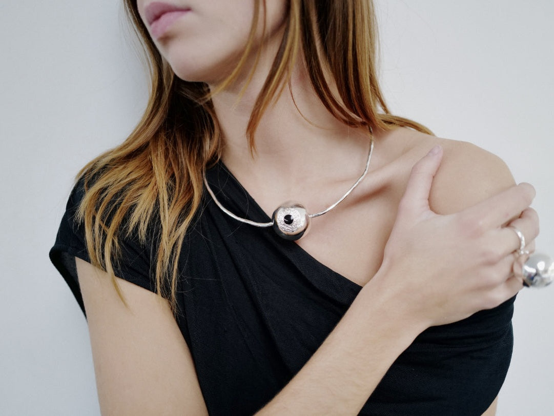 A sculptural statement piece crafted in 925 silver-plated bronze. The bold, polished dome catches light like a distant planet, centered with a dark, textural void — a contrast between presence and mystery. Its open-back band is fully adjustable for a comfortable, flexible fit across sizes. Raw yet refined, The Orb Ring is a wearable sculpture — for those who move between worlds.