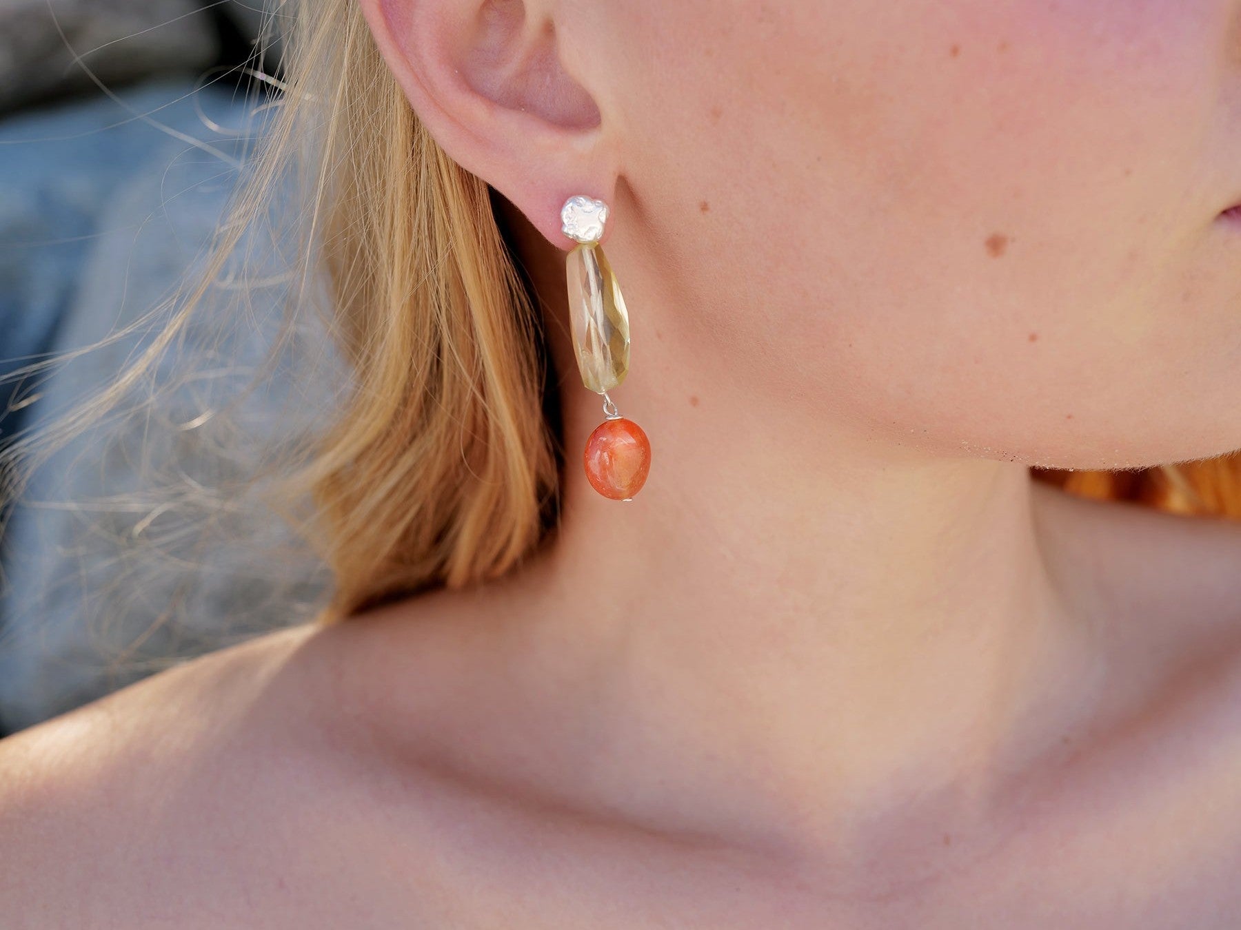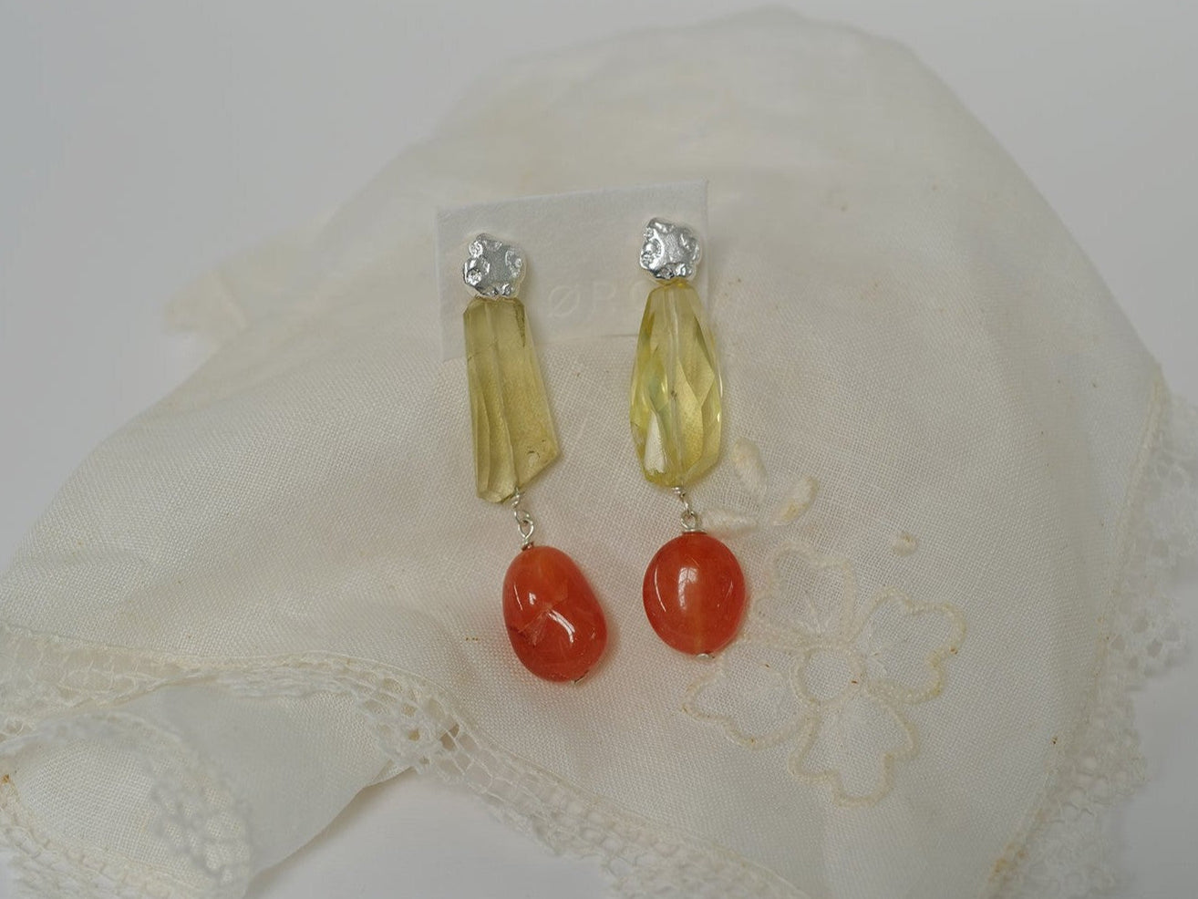Handmade and unique, these 925 silver ear studs are adorned with bright orange Carnelian and Lemon Topaz.