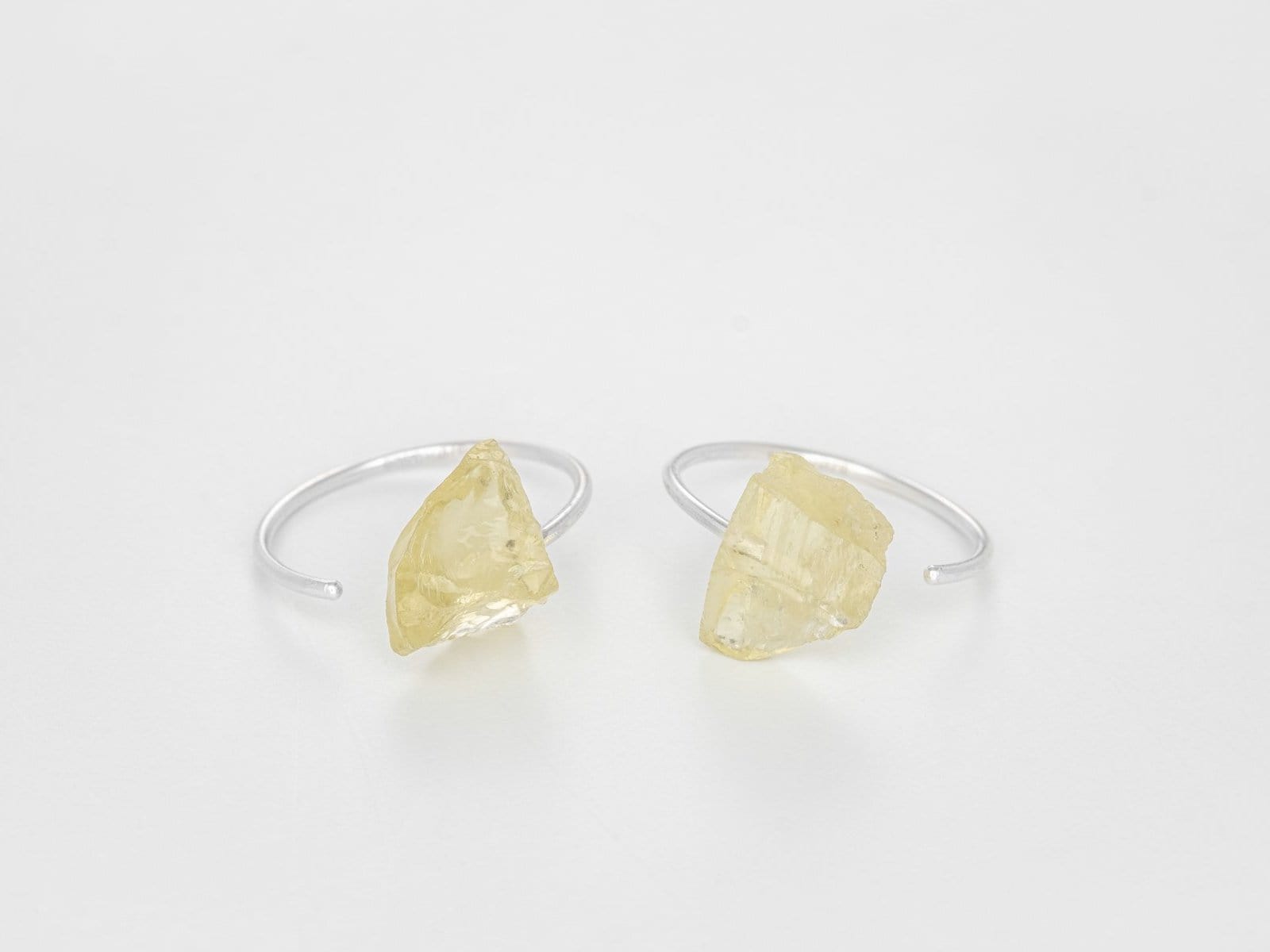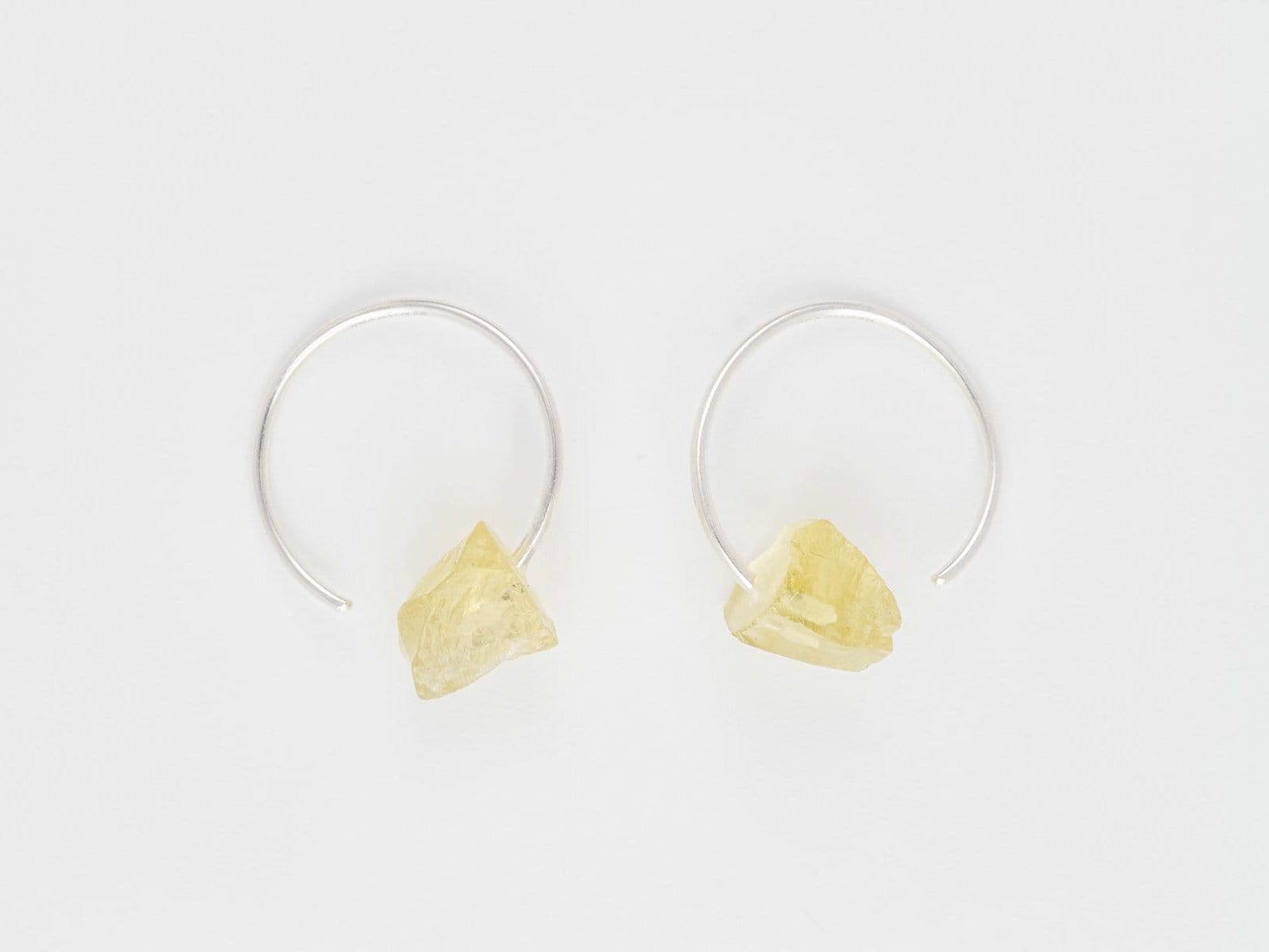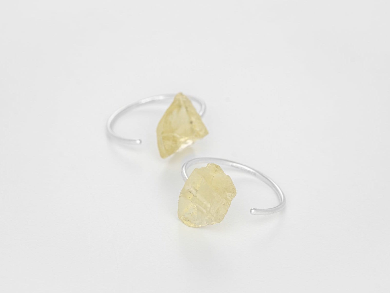 Delicate and happy ear hoops handcrafted in fine 925 silver with natural rough Lemon Quartz gemstones.