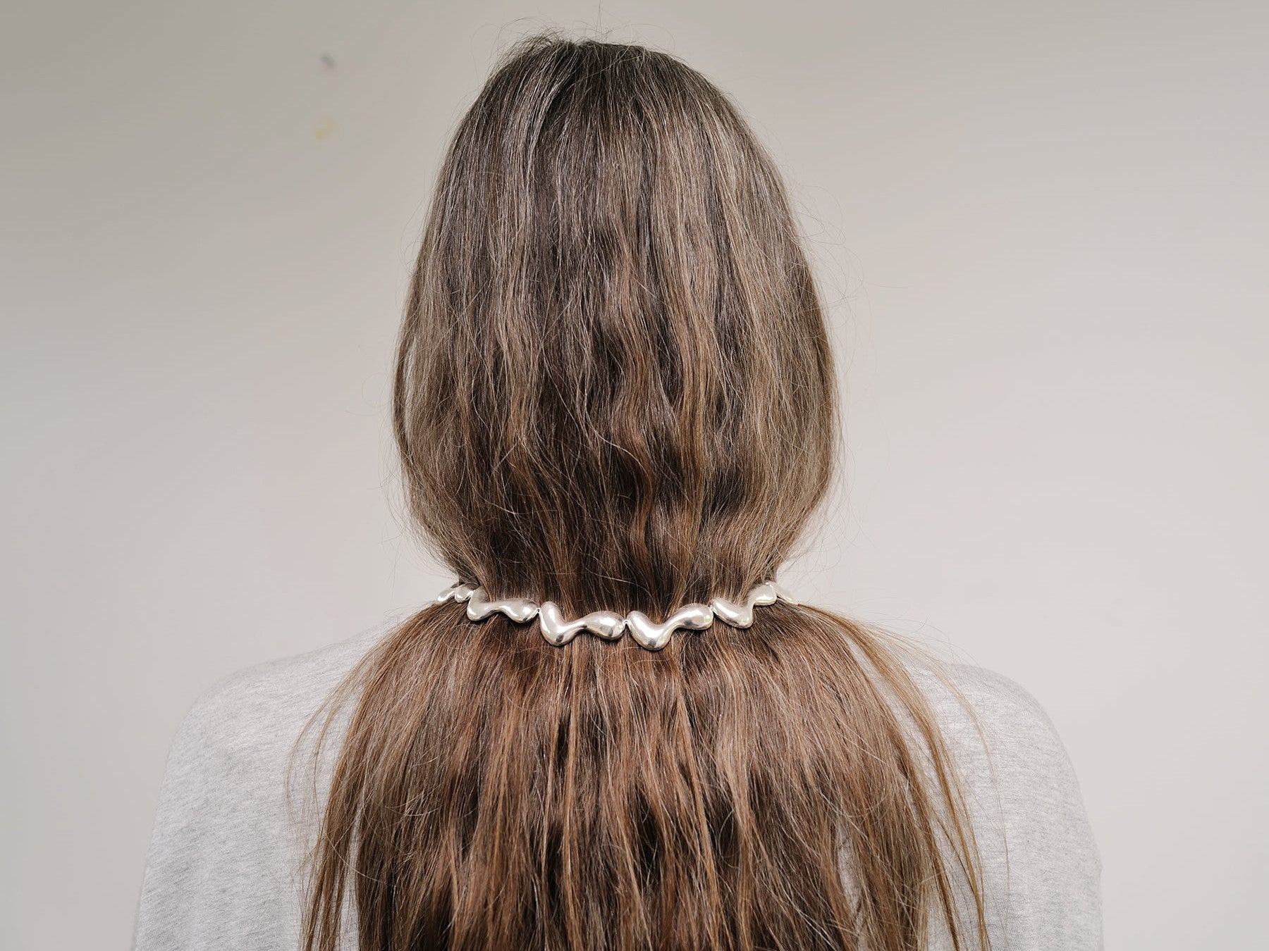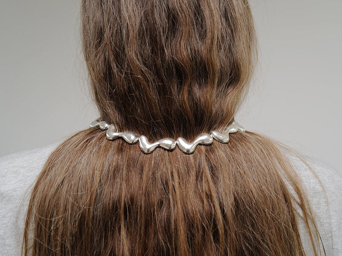 Each link a fragment of sky, hand-carved into soft, weightless waves.