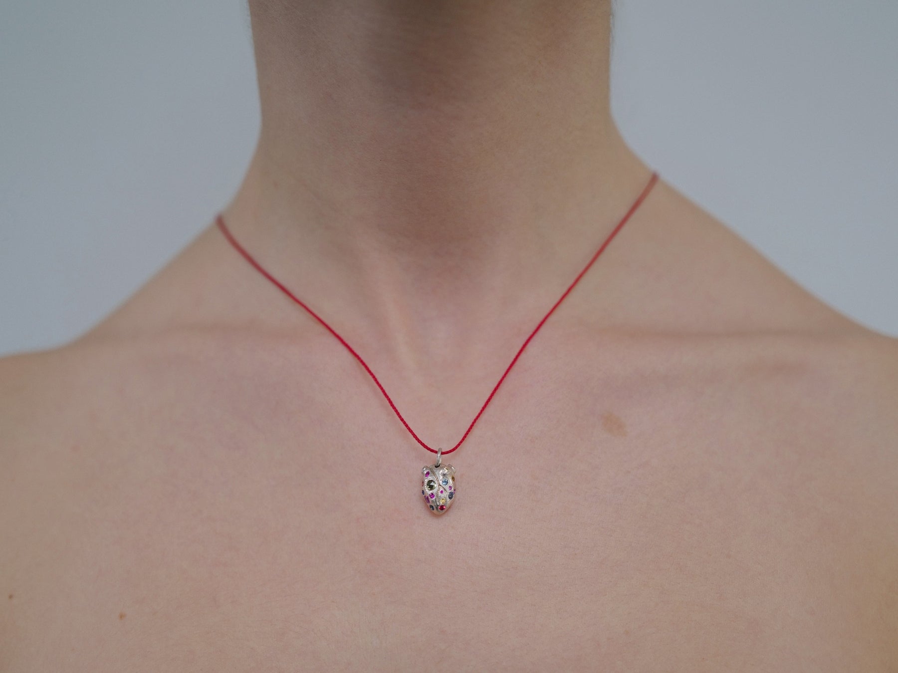A hand-sculpted heart in fine sterling silver, detailed with rainbow sapphires that catch the light like a shifting spectrum of feeling — a quiet fire held in metal.