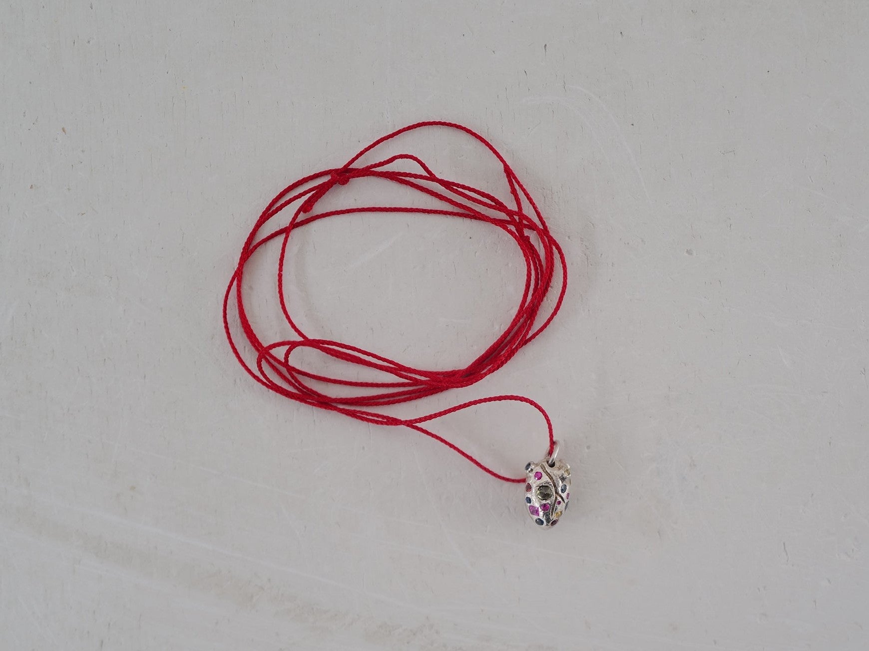 Carried by Japanese red silk, chosen for its strength, softness, and symbolic protection.