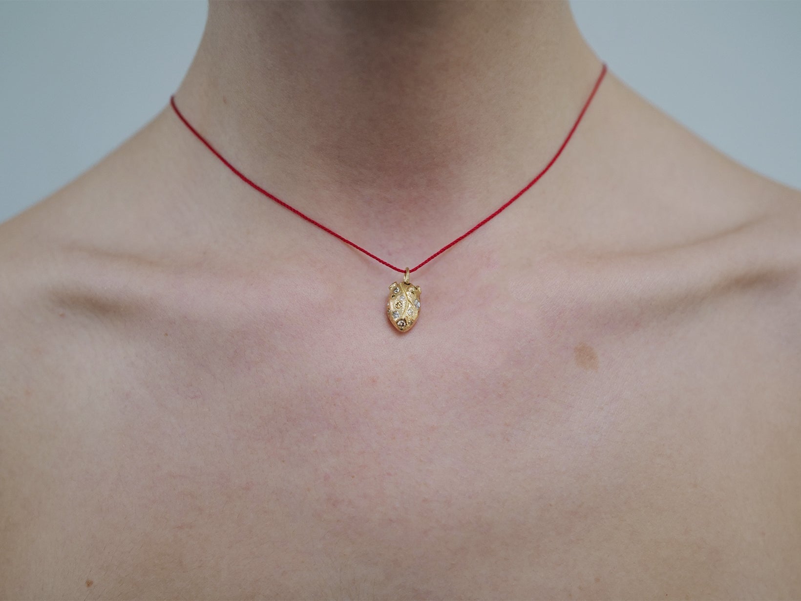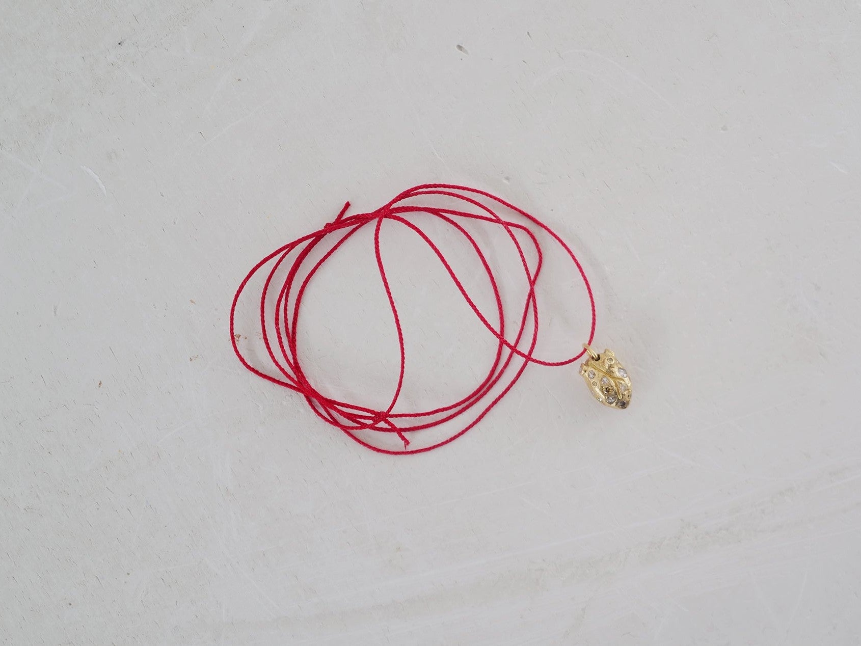 Carried by Japanese red silk, chosen for its strength, softness, and symbolic protection.