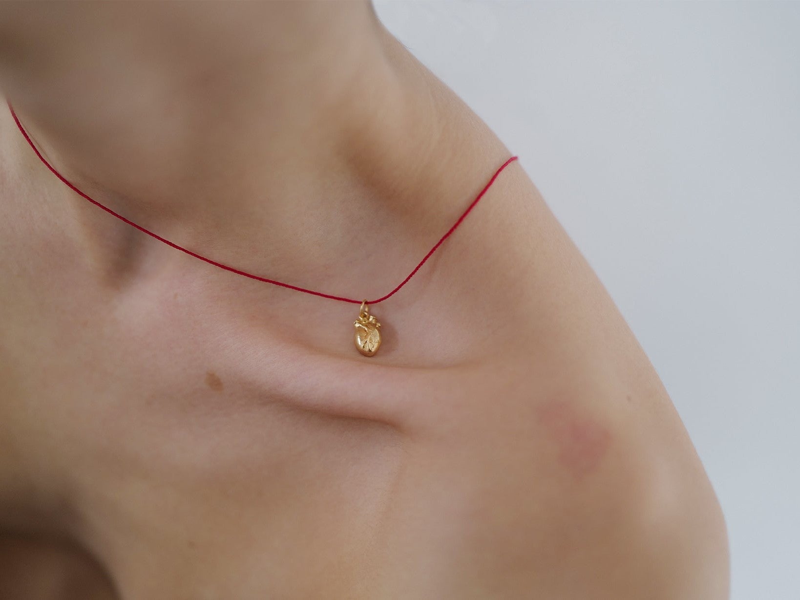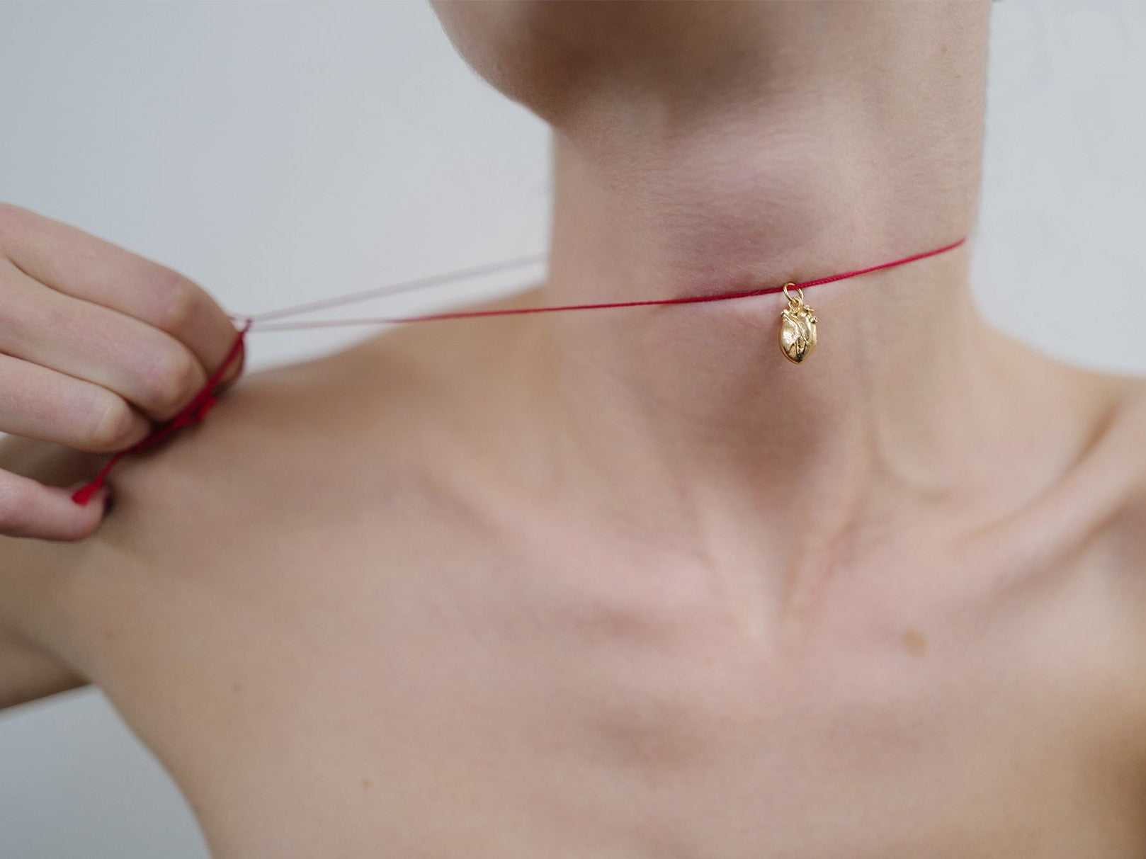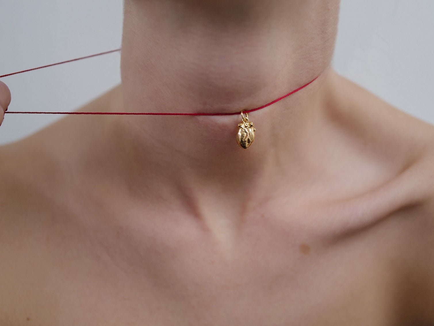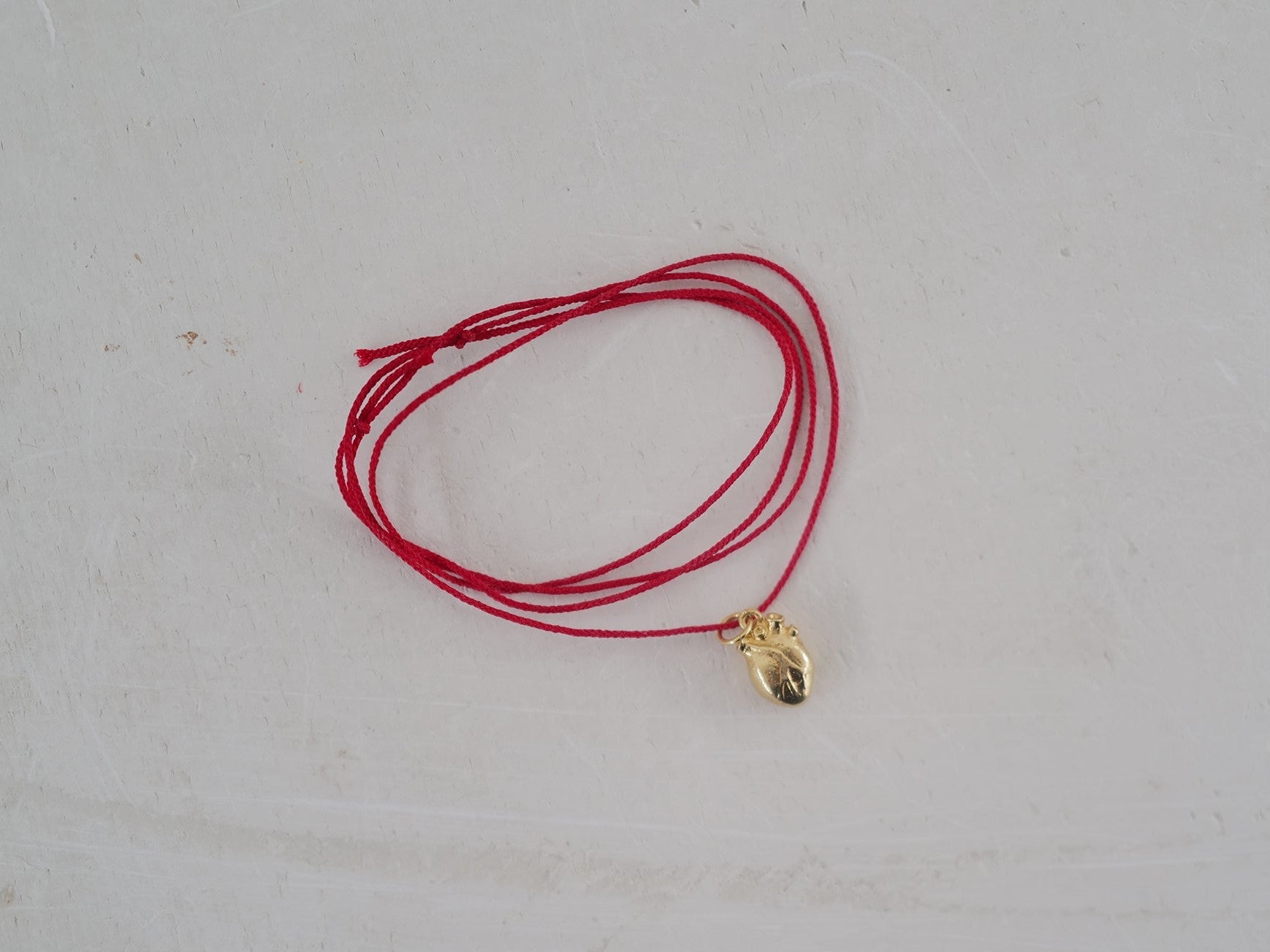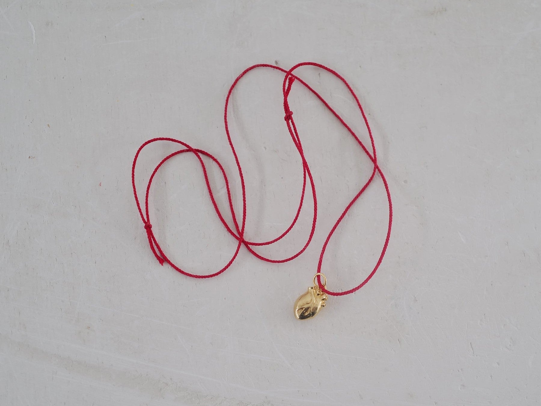 A fierce heart held by a single red handbraided Japanese silk thread.
