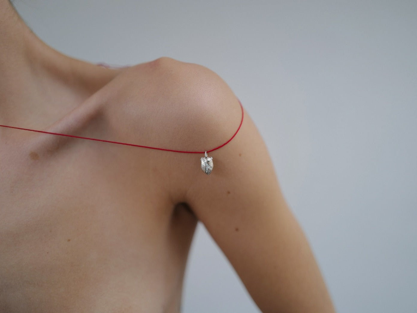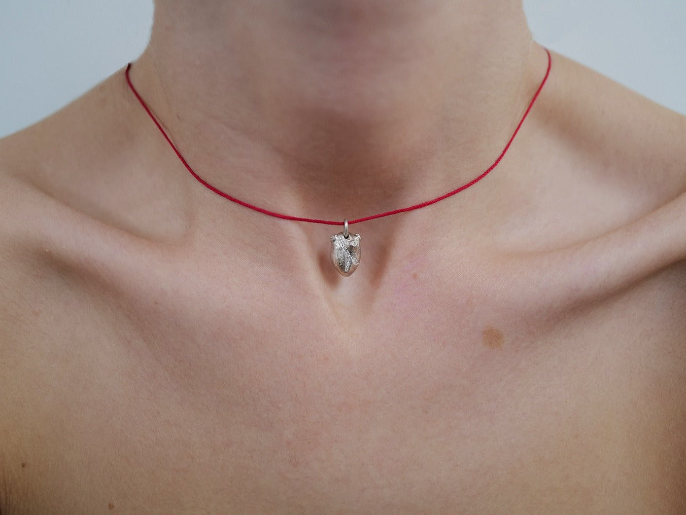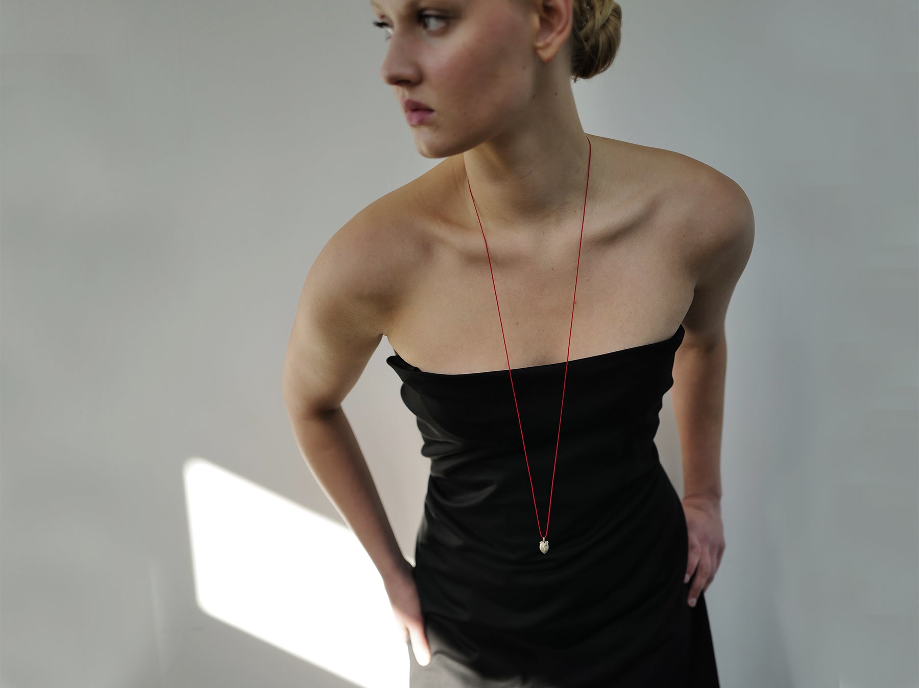 Carried by Japanese red silk, chosen for its strength, softness, and symbolic protection.